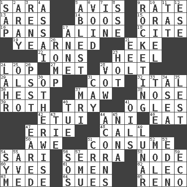 ACROSS 1. "Two Mules for Sister ____" 5. Advice 9. Assign a rank or rating to 13. Ancient Greek god of war 14. Scornful sounds 15. Mouths or openings 16. Baking dishes 17. Place in a line 18. Quote 19. Felt deep pity or tenderness 21. Make supply last 22. Charged atoms 23. The bottom of a shoe or boot 24. Trim (branches) 27. Was introduced to 28. Electrical Unit 29. Columnist Joseph or Stewart 31. Small bed 32. Slanted text style (abbr.) 36. Behest 37. Informal term for the mouth 38. Sense of smell 39. Writer of Portnoy's Complaint (1969) 40. Attempt to accomplish something 41. Stares at amorously 42. Needle holder 44. Black tropical American cuckoo 46. Consume 47. One of the Great Lakes 48. Give a ring to 50. Deep reverence 51. Ingest 54. Indian skirt 56. Spanish missionary in California 58. Thickened enlargement 60. Jacques Cousteau's middle name 61. Sign of things to come 62. Actor Baldwin 63. Ancient Persian 64. Takes to court 65. Former U.S. Attorney General Janet DOWN 1. Plant excrement 2. Like ___ of sunshine 3. French philosopher Descartes 4. Slender Brazilian palm 5. Most capable 6. Lacking any legal or binding force 7. Electrically charged atom 8. Compass dir. 9. Shooting up abruptly 10. Satellite of Uranus 11. Make lace 12. Compass dir. 17. Singer Murray 20. Play 21. Snakelike fish 23. Being at a high temperature 24. Cowardly lion portrayer 25. Margarine 26. Inconspicuous attention getter 28. Solemn pledge 30. Else 31. Island 33. Lacquered or enameled metalware 34. At sea 35. For fear that 37. Medical imaging device (abbr.) 40. Third day of the wk. 41. Petroleums 43. Standoff 44. Oak nuts 45. Nanny 47. Having ears or earlike features 49. Type of eclipse 51. Algonquian 52. Undercover agent 53. Paradise 54. Symbol (abbr.) 55. "___ Maria" 56. Mayday 57. Australian flightless bird 59. Environmental prefix