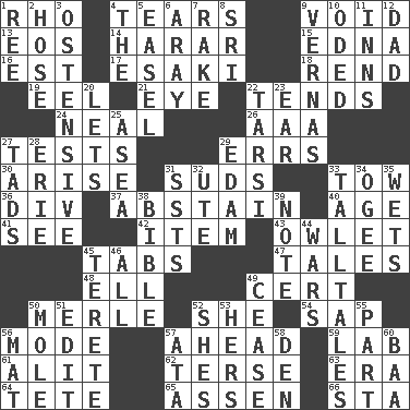 ACROSS 1. 17th letter of the Greek alphabet 4. Lacerates 9. Nothingness 13. Greek goddess of the dawn 14. Ethiopian city, capital of Harari 15. Pulitzer Prize-winning author Ferber 16. Eastern Standard Time (abbr.) 17. 1973 Nobel Price Winner (Physics) Leo 18. Tear apart 19. Snakelike fish 21. Sight organ 22. Looks after 24. Anneal 26. Auto club (abbr.) 27. Trials 29. Blunders 30. Get up 31. Beer foam 33. Pull behind 36. HTML Container Element 37. Choose not to consume 40. Ripen 41. Observe 42. A distinct part 43. A small or young owl 45. Bar bills 47. Stories 48. Pipe bend 49. An absolute certainty 50. Haggard of country music 52. A female animal or person 54. Plant excrement 56. Method 57. At or in the front 59. Experiment locale 61. Came down and settled, as after flight 62. Laconic 63. Period 64. False hair 65. NE Netherlands city 66. R.R. building DOWN 1. To separate or throw off 2. Stockings 3. Clearly or manifestly demonstrative 4. Definite Article 5. Artist's stand 6. Like ___ of sunshine 7. Immoral or dissolute person 8. Indian title of respect (Mr.) 9. Actresses Bloom and Felton 10. Wrote a lyric poem 11. Lodging establishments 12. June honoree 20. Allows 22. Tarsus (plural) 23. Hearing organ 25. Toward the sea 27. Bits 28. One of the Great Lakes 29. Dutch treat 31. Fast planes 32. Shoshoni 33. Baron Munchausen's specialties 34. Double curve, resembling the letter S 35. Soaks 38. The Good Book 39. Musical sound 44. Armed conflicts 45. Cigar-shaped 46. 100% 49. Stop 50. Undercover agent 51. Prepare for publication 52. "______ My Girl" (Turtles hit) 53. Possessive pronoun 55. Piece 56. Floor protector 57. _ moment's notice (2 wds.) 58. Lair 60. Sound made by sheep