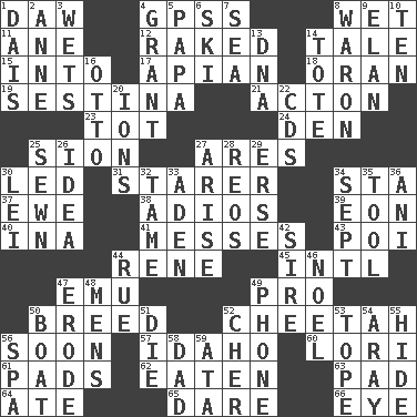 ACROSS 1. Obsolete 4. Global Positioning Systems (abbr.) 8. Dripping 11. A saturated hydrocarbon 12. Swept the length of 14. Lie 15. To the inside or interior of 17. Bee-related 18. Northwest Algerian city 19. French poetic form 21. 13-14th century defensive garment 23. Small child 24. Lair 25. The Jewish people; Israel 27. Ancient Greek god of war 30. Directed 31. A viewer who gazes fixedly 34. R.R. building 37. She-sheep 38. Goodbye (Sp.) 39. A really long time 40. _ tizzy (2 wds.) 41. Makes clutter 43. Luau course 44. French philosopher Descartes 45. International (abbr.) 47. Australian flightless bird 49. Adept person 50. A special lineage 52. Leopard's kin 56. Within a short period 57. Potato state 60. Australian parrot (variant) 61. Groovy apts. 62. Ingested 63. Groovy apt. 64. Had dinner 65. Have the gumption 66. Sight organ DOWN 1. Raised platform 2. Queen of England 1702-14 3. Soaks 4. Monetary aid 5. Dad 6. What Jean-Claude Killy likes to do 7. Ocean 8. Make _____ (do battle with) 9. Flair 10. Nine, plus one 13. Heredity factor (abbr.) 14. Carry 16. Von Bismarck 20. Charged atoms 22. Music discs 25. Stitched 26. It may be bright or harebrained 27. Originate 28. Vintage cars 29. Celtic language 30. Luau accessory 32. Not wild 33. An important port of Yemen 34. Back-to-school mo. 35. Utensil 36. Black tropical American cuckoo 42. Title for a man of rank and authority 44. Regret 46. Christmas carol 47. Wear away 48. Not women's 49. Give a jingle 50. Water vessel 51. Pass on 52. "Mermaids" star 53. Drink excessively 54. Like ___ of sunshine 55. Flintstone garb 56. Health resort 58. June honoree 59. _ moment's notice (2 wds.)