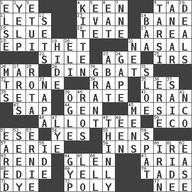 ACROSS 1. Sight organ 4. Peachy ____! 8. Small amount or degree 11. Allows 13. "Terrible" tsar 14. Object of repulsion 15. Change direction abruptly 16. False hair 17. Type of rug 18. Curse 21. Rhinal 22. Filth; sediment 23. Ripen 25. Big collection agency 26. Make imperfect 29. Empty-headed or silly people 32. Marketplace scale 34. Hit sharply and swiftly 35. French article 38. Stalk of a moss capsule 39. Speak pompously 41. Northwest Algerian city 43. Plant excrement 44. Commissioned mil. rank 45. Mesonic 46. One to whom something is allotted 50. Environmental prefix 51. Compass dir. 54. It is so 55. Coop moms 57. Nest on high 59. Motivate 63. Tear apart 64. Small, secluded valley 67. Operatic vocal solo 68. Singer Brickell 69. Shout 70. Small boys 71. Color 72. Much (prefix) 73. Born DOWN 1. Otherwise 2. Sharp bark 3. Needle case 4. Baby cat 5. First lady 6. Ingest 7. Compass dir. 8. Tarsus (plural) 9. Approach 10. Allots cards 12. Arranges properly for use 14. Sound made by sheep 19. Flintstone garb 20. Connecticut Ivy Leaguer 21. Remaining after all deductions 23. Blind as ____ 24. Stare wonderingly 26. Mountains (abbr.) 27. Ancient Greek god of war 28. Round or rotation of duties 30. Let have 31. A type of plum 33. California wine valley 36. Celtic language 37. Ketch in the Levant 39. Stare 40. Vintage cars 42. Non-commissioned officer (abbr.) 45. Not women's 47. Sodium hydroxide 48. Without force or sincere effort 49. Car or cant ending 51. Having ears or earlike features 52. Sleazy 53. Bert's buddy 56. Argument over a trivial matter 58. Binary compound 60. SW Asia republic 61. Travel on or in a vehicle 62. Comfort 64. Flimflam 65. Lion 66. Pipe bend