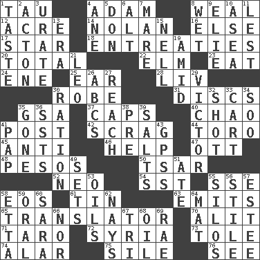 ACROSS 1. The 19th letter of the Greek alphabet 4. First man 8. Welt 12. Measure of real estate 14. Pitcher Ryan 16. Otherwise 17. Play the lead 18. Pleas 20. Add up to 22. Shade tree 23. Ingest 24. Compass dir. 25. Ewer handle 28. 54 in ancient Rome 30. Loose flowing garment 31. Flat circles 35. Girls' org. (abbr.) 37. Smile enhancers 40. US Secretary of Labor Elaine L. _ 41. Mail 42. Strangle with an iron collar 44. "Corrida" creature 45. Against 46. Assist 47. Baseball player Mel 48. Mexican monetary units 50. Russian ruler of old 52. Modern: prefix 54. Fast jet (abbr.) 55. Compass dir. 58. Greek goddess of the dawn 61. Shallow baking pan 63. Gives off 65. Interpreter 70. Set down 71. Edible starchy tuberous root 72. Damascus' land 73. Lacquered or enameled metalware 74. Having or resembling wings 75. Drop; flow; fall 76. Observe DOWN 1. Clothes sense 2. Gambison 3. A salt of uric acid 4. One (Scot) 5. Spanish title 6. Keyboard modifier key 7. Female horse 8. Dripping 9. Writer Wiesel 10. At sea 11. For fear that 13. Epoch 15. 1994 drama film starring Jodie Foster 19. Among 21. Lion 26. Lettered men learn these first 27. Arrive at 29. Winning man's name 30. Food allowance for one day 32. Guess 33. Draw slowly or heavily 34. "Barney Miller" actor Jack 35. Went 36. Fast planes 38. Before (prefix) 39. Table seasonings 41. Infant food 43. Global Positioning Systems (abbr.) 49. Puts into a specified state 51. Had dinner 53. Lubricates 55. Grain storage towers 56. Vertical member of a panel or frame 57. First name in cosmetics 58. Singer James 59. Relating to the mouth 60. "Two Mules for Sister ____" 62. Negative votes 64. Floor protector 66. Not either 67. Three (prefix) 68. Petroleum 69. Actress Charlotte