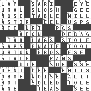 ACROSS 1. Infant locale 4. Indian skirt 8. Sight organ 11. Mountain range 13. Splash clumsily 15. Turn to the right 16. Olfactory organ 17. Eating place 18. Place where flour is made 19. Moving or stirring 21. Snakelike fish 22. United States Postal Service (abbr.) 23. To separate or throw off 24. RI univ. 27. Personal Computers (abbr.) 29. A really long time 30. Debunk (Brit. slang) 34. Keyboard key 36. Fails to keep up a pace 39. Fur scarf 40. Plant excrements 41. Maternal 43. Instrument 44. Greek mythologigal hunter 46. Greek god of love 47. Compass dir. 48. Showing deterioration from age 49. Baking dishes 51. Shoshoni 53. Take to court 54. Compass dir. 57. Gouge 60. No longer planned or scheduled 63. Sends forth 65. Mitch Miller's instrument 66. Annoying sound 69. Set down 70. Being at a high temperature 71. Having a sole or soles 72. Lacquered or enameled metalware 73. A saturated hydrocarbon 74. Beverages made from leaves 75. Observe DOWN 1. Type of eclipse 2. Came up 3. Thick mixture 4. Fast jet (abbr.) 5. Wing 6. Loose flowing garment 7. Capri or Wight 8. Armor plate that protects the chest 9. Sharp bark 10. Snakelike fish 12. Flowery wreath 14. Assist 18. French bagpipes 20. Sorrow 25. Hero or heavy, e.g. 26. Lacking in sense or substance 28. Music discs 29. Utter; complete 31. Expressions of contempt or scorn 32. _ vera 33. Set 34. Small pie 35. Capital of Western Samoa 37. Slender fish 38. Obstructs or blocks passage 40. Mayday 42. Son of Isaac 45. Remaining after all deductions 50. Born 52. Immeasurably long periods of time 54. Grain storage towers 55. Vertical member of a panel or frame 56. First name in cosmetics 57. Capital of the state of Qatar 58. Inky black, to poets 59. Short letter 61. One third of a yard 62. Do some clerical work 64. Floor protector 67. Ocean 68. Begley and Asner