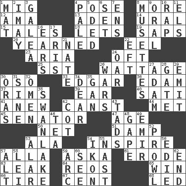 ACROSS 1. Russian fighter aircraft 4. Introduce or present, as a question 8. Greater amount 12. Nanny (var.) 13. Arabian gulf 14. Mountain range 15. Lies 18. Allows 19. Plant excrements 20. Had a strong desire 22. Snakelike fish 23. Roberta Peters solo 24. Often (poetically) 25. Fast jet (abbr.) 26. Electrical Measurement 30. Bear (Spanish) 33. _ Allan Poe 36. Dutch treat 37. Basketball hoops 39. Ewer handle 40. Suttee (variant) 41. Afresh 42. 2nd pers. sing. pres. of can (arch.) 44. Was introduced to 45. Elected representative 47. Mature 50. Remaining after all deductions 51. Moist 53. Chicken ___ king 54. Stimulate to action 57. Silent film actress Nazimova 59. "____ silly question..." 61. Wear away 63. Path through which fluid escapes 64. Vintage cars 65. Victory 66. Hoop that covers a wheel 67. Penny 68. Directed DOWN 1. Floor covering 2. "If ____ say so..." 3. An organ shaped like a helmet 4. Light colored 5. Wrote a lyric poem 6. Arrange properly for use 7. Followers of ems 8. French bagpipes 9. Spoken 10. Strike 11. Raised railways 16. Hearing organs 17. Indian titles of respect 21. Nathan's nickname 22. Bank Draft (abbr.) 24. Boat paddle 26. Armed conflicts 27. First of billions? 28. Yard entry 29. Send forth 30. Mouths or openings 31. Trig term 32. Sign of something about to happen 34. Letter starter 35. Separate the seeds from cotton 38. Tchaikovsky ballet 42. Small bed 43. Bits 46. Beverage made from leaves 48. Open wide 49. Arab leader 52. Move like a hungry wolf 53. Having or resembling wings 54. Image 55. Political cartoonist Thomas 56. Singer Brickell 57. The first octave above the treble staff 58. Flowery wreath 59. Curve 60. Observe 62. Conclusion