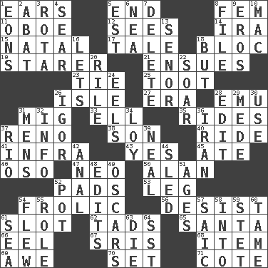ACROSS 1. Hearing organs 5. Conclusion 8. Opposite of masc. 11. Mitch Miller's instrument 12. Observes 14. Retirement account (abbr.) 15. Brizilian seaport 17. Falsehood 18. Group of countries in special alliance 19. A viewer who gazes fixedly 21. Follows as a consequence or result 23. Make a knot 25. A blast of a horn 26. Small island 27. Epoch 28. Australian flightless bird 31. Russian fighter aircraft 33. Pipe bend 35. Amusement-park features 37. Western Nevada city 38. Manchild 40. Travel on an animal 41. Kind of red light 43. It is so 45. Had dinner 46. Bear (Spanish) 47. Modern: prefix 50. ____ Jay Lerner 52. Writing tablets 53. Part of a journey 54. Play 56. Stop 61. Slit 62. Bits 65. Before Barbara or Clara 66. Snakelike fish 67. Indian titles of respect 68. A distinct part 69. Deep reverence 70. Arrange properly for use 71. ____ d'Azur (French Riviera) DOWN 1. Immeasurably long periods of time 2. Blind as ____ 3. Roll call or roster of names 4. Dry up 5. Eastern Standard Time (abbr.) 6. Teachers' org. 7. Keyboard key 8. Do some clerical work 9. Greek god of love 10. Big _ 13. Sir (Sp.) 16. Allows 18. Yet 20. Cause heat under the collar 22. Fly high 24. Snakelike fish 26. Russian composer Stravinsky 28. Prepare for publication 29. Ancient Persian 30. Purpose 31. Not women's 32. Information 34. Myrna of the movies 36. SW Asia republic 37. River (Sp.) 39. Be tempered by heat 42. Of or related to the anus 44. Downhill vehicle 48. Prepares for publication 49. Motion picture awards 51. Grows older 52. Cooking vessel 54. Soared 55. Hero or heavy, e.g. 57. Ketch in the Levant 58. To the inside or interior of 59. Proofreading order 60. Docile 61. Ocean 63. Pass on 64. Fast jet (abbr.)
