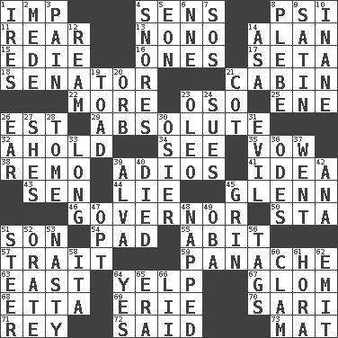 ACROSS 1. Naughty child 4. Elected reps. 8. 23rd letter of the Greek alphabet 11. Tail end 13. Words to Nanette 14. ____ Jay Lerner 15. Singer Brickell 16. Singles 17. Bristle 18. Legislator 21. Apartment or room in a ship 22. Greater amount 23. Bear (Spanish) 25. Compass dir. 26. Eastern Standard Time (abbr.) 29. Utter; complete 32. Hold, grip (Informal) 34. Observe 35. Solemn pledge 38. San ____ (Riviera town) 39. Goodbye (Sp.) 41. It may be bright or harebrained 43. Elected rep. 44. Untruth 45. American astronaut and politician John 46. State head 50. R.R. building 51. Manchild 54. Groovy apt. 55. "This won't hurt ____!" 57. Distinguishing feature 59. Flamboyance 63. Compass direction 64. Sharp bark 67. Seize upon or latch onto something 68. Singer James 69. 4th largest of the Great Lakes 70. Indian skirt 71. Marina Del _, California 72. Expressed in words 73. Floor covering DOWN 1. Angers 2. Ancient Persian 3. Ache 4. Sounds asleep 5. Period of immesurable duration 6. Compass dir. 7. Mayday 8. Military trainee 9. Smooth fabric 10. Lacking in sense or substance 12. 480, 500 or 516 sheets of paper 14. White ___ sheet 19. Frog relative 20. Globe 21. Small bed 23. Margarine 24. Takes to court 26. Ewer handle 27. "______ My Girl" (Turtles hit) 28. Heavy book 30. Flexible twig of a willow tree 31. Tending to cause great harm 33. Having great length 36. Lyric poems 37. Gone 39. Inventor's middle name 40. Passed on 42. Santa ___, CA 45. Amused look 47. Elect 48. Slept 49. Chief or king in Benin or Nigeria 51. Guide 52. Declaim 53. Smutty 56. Labels 58. Call ___ day 60. Dollar (slang) 61. Israeli folk dance 62. Give off 64. It is so 65. Period 66. Cards in a Roman deck?