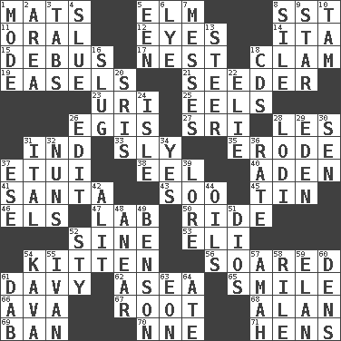 ACROSS 1. Floor protectors 5. Shade tree 8. Fast jet (abbr.) 11. Relating to the mouth 12. Sight organs 14. Call ___ day 15. Alight from a bus 17. A home for chicks 18. Burrowing marine mollusk 19. Artist's stands 21. Sowing specialist 23. RI univ. 25. Snakelike fish 26. Armor plate that protects the chest 27. _ Lanka 28. French article 31. Working for oneself (abbr.) 33. Secret 35. Wear away 37. Needle holder 38. Snakelike fish 40. An important port of Yemen 41. Before Barbara or Clara 43. "Barney Miller" actor Jack 45. Shallow baking pan 46. Raised railways 47. Experiment locale 50. Travel on or in a vehicle 52. Trig term 53. Connecticut Ivy Leaguer 54. Baby cat 56. Flew 61. American folk hero Crockett 62. At sea 65. Grin 66. Actress Gardner 67. Carrot, for example 68. Actor Alda or Thicke 69. Forbid 70. Compass dir. 71. Coop moms DOWN 1. Method 2. Type of rug 3. Bar bills 4. Change direction abruptly 5. Car or cant ending 6. Sodium hydroxide 7. Makes clutter 8. Drop; flow; fall 9. Play the lead 10. Scottish cap 13. Bull 16. A hard, heavy blow 18. Music discs 20. Indian titles of respect 22. Writer Wiesel 24. Capri or Wight 26. Prepare for publication 28. Farming town in central California 29. Locale of original sin 30. Elected rep. 31. Slanted text style (abbr.) 32. Religious women 34. Consenting reply 36. Pace 37. Compass dir. 39. Old wives' tales, e.g. 42. Set down 44. Petroleums 48. Approach 49. Gillaume's butler role 51. "Vaya con ____" 52. Filthy place 54. Polynesian shrub of the pepper family 55. _ the terrible 57. Nursemaid 58. Cause heat under the collar 59. Style 60. Habitations of wild animals 61. Pat or tap gently 63. Period of immesurable duration 64. Had dinner