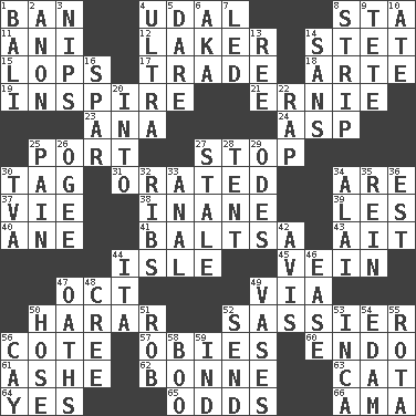 ACROSS 1. Prohibit 4. Allodial 8. R.R. building 11. Black tropical American cuckoo 12. Member of a famous L.A. basketball team 14. Proofreading order 15. Chops off 17. Barter 18. Johnson of "Laugh-In" 19. Stimulate to action 21. Bert's buddy 23. Santa ___, CA 24. Viper 25. Sweet dark-red dessert wine 27. Close up, plug up 30. Label 31. Spoke pompously 34. "We ___ not amused" (Victoria) 37. Compete 38. Lacking in sense or substance 39. French article 40. A saturated hydrocarbon 41. Greek mezzo-soprano Agnes 43. Small island 44. Capri or Wight 45. Distinctive style or manner 47. Sep. follower 49. By way of 50. Ethiopian city, capital of Harari 52. More disrespectful 56. ____ d'Azur (French Riviera) 57. Off-Broadway awards 60. Inside; within (prefix) 61. American tennis player Robert 62. Maid-servant 63. Domesticated feline 64. It is so 65. Probability 66. Nursemaid (var.) DOWN 1. Indonesian resort city 2. Soon (poet.) 3. Pinches, bites 4. Extremist 5. Have the gumption 6. Alias (abbr.) 7. Directed 8. Remove all contents or possession from 9. Wig 10. Had dinner 13. Portuguese money of account (variant) 14. Without 16. Practice fight 20. To the inside or interior of 22. Reproach for some lapse or misdeed 25. Ache 26. Double curve, resembling the letter S 27. Showing deterioration from age 28. Portable shelter 29. Lyric poems 30. Federal power corp. 32. Chest bones 33. Of or related to the anus 34. Jai _ 35. It's straight from the horse's mouth 36. Eastern Standard Time (abbr.) 42. Advice 44. Call ___ day 46. Comfort 47. Curses 48. Algonquian 49. Flower holders 50. Stockings 51. Director Reiner 52. Transmit 53. South American Indian 54. Dutch treat 55. Round or rotation of duties 56. Island 58. Oct. 31 cry 59. Indiana (abbr.)