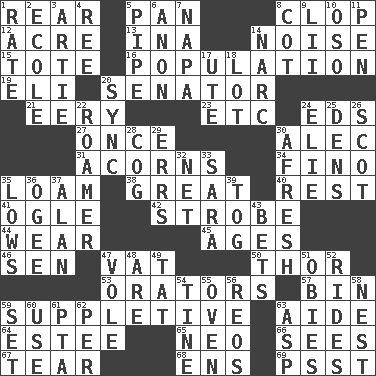 ACROSS 1. Located in or toward the back 5. Baking dish 8. Hoof sound 12. Land measure 13. _ tizzy (2 wds.) 14. Annoying sound 15. Lug 16. Census information 19. Connecticut Ivy Leaguer 20. Elected representative 21. Suggestive of the supernatural 23. And so on (abbr.) 24. Begley and Asner 27. At one time in the past 30. Actor Baldwin 31. Oak nuts 34. A pale, very dry sherry 35. Rich soil 38. Relatively large 40. Repose 41. Stare at amorously 42. Disco prop 44. Put on (as clothing) 45. Grows older 46. Elected rep. 47. Large container 50. Son of Odin 53. Speakers 57. Storage container 59. Supplementary 63. Assistant 64. First name in cosmetics 65. Modern: prefix 66. Perceives with the eye 67. Rend 68. Followers of ems 69. Inconspicuous attention getter DOWN 1. Assign a rank or rating to 2. Learning spot: Fr. 3. Nick name for Arthur 4. Portuguese money of account (variant) 5. Corncob 6. At once, immediately (arch.) 7. California wine valley 8. Small bed 9. Cards in a Roman deck? 10. Bear (Spanish) 11. Animal enclosure 14. Drug cop 17. Shoshoni 18. Car dealer's back yard 20. Synchronize (abbr.) 22. Wanderer 24. Writer Wiesel 25. Habitations of wild animals 26. Highlander 28. Gear tooth 29. Blunders 30. Anew 32. Remaining after all deductions 33. "Two Mules for Sister ____" 35. Coldest temperatures 36. Double curve, resembling the letter S 37. ____ Jay Lerner 39. Coat; cloak 43. Antes 47. Grand slam 48. "We ___ not amused" (Victoria) 49. Make lace 51. Off-Broadway awards 52. Amusement-park features 54. Prong on a fork 55. Baking chamber 56. Vintage cars 58. A home for chicks 59. Put into a specified state 60. Purpose 61. Parent Teacher Association (abbr.) 62. For each 63. Viper