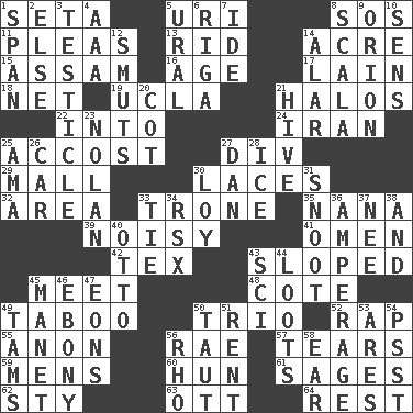 ACROSS 1. Stalk of a moss capsule 5. RI univ. 8. Distress signal 11. Entreaties 13. To free from 14. Measure of real estate 15. Indian state 16. Grow older 17. (Had) reclined 18. Fish or hair follower 19. Southern CA. univ. 21. Radiant circles of light 22. To the inside or interior of 24. SW Asia republic 25. Buttonhole 27. HTML Container Element 29. Shopping center 30. Shoestrings 32. Type of rug 33. Marketplace scale 35. Grandmother 39. Annoyingly loud 41. Presage 42. John Ritter's dad 43. Had an oblique or slanted direction 45. Rendezvous 48. ____ d'Azur (French Riviera) 49. Off limits 50. Musical group of three 52. Strike 55. At once, immediately (arch.) 56. Actress Charlotte 57. Rends 59. Not women's 60. Attila the _ 61. Gurus 62. Filthy place 63. Baseball player Mel 64. Relief DOWN 1. Connect, as a bridge 2. Otherwise 3. A testis 4. Auto club (abbr.) 5. Mountain range 6. Port city in Latvia 7. Binary compound 8. Any of the three canals of the cochlea 9. Constellation of myth 10. Elected reps. 12. Obscenities 14. Having or resembling wings 20. Small bed 21. Hub of activity 23. Pitcher Ryan 25. Nursemaid (var.) 26. 4-wheeled motor vehicle 27. Daniel's nick name 28. Frozen water 30. Myrna of the movies 31. Snout, nose 33. Make a knot 34. Acura sports coupe 36. Electrical Measurement 37. Born 38. Also 40. Von Bismarck 43. _-fi 44. Plunders 45. French painter Edouard 46. Black 47. Immeasurably long periods of time 49. Scottish caps 50. Pulled tight 51. Monthly bill 53. Ancient Greek god of war 54. Inconspicuous attention getter 56. 17th letter of the Greek alphabet 58. Ewer handle
