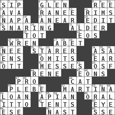 ACROSS 1. Small drink 4. Small, secluded valley 8. To separate or throw off 11. Actress Gardner 12. The wife of a rajah (variant) 14. Basketball hoops 15. California wine valley 17. Approach 18. Prepare for publication 19. Catching in a trap 21. Tree or shrub in the Birch family 23. Small child 24. Greek goddess of the dawn 25. Songbird 27. Collude with 30. Born 31. A viewer who gazes fixedly 34. White ___ sheet 37. Followers of ems 38. Leaves out 39. Hearing organ 40. Baseball player Mel 41. Makes clutter 43. Order of Saint Francis (abbr.) 44. French philosopher Descartes 45. Immeasurably long periods of time 47. Adept person 49. Domesticated feline 50. First-year military academy student 52. Chrissie's court nemesis 56. Grant temporary use of 57. Bee-related 60. Relating to the mouth 61. "Tell ____ the Marines!" 62. Portable shelters 63. Sight organ 64. Compass dir. 65. Political cartoonist Thomas 66. Compass dir. DOWN 1. Without 2. "Terrible" tsar 3. Dad 4. Monetary aid 5. Austrian-born American filmmaker Fritz 6. Compass dir. 7. Teachers' org. 8. Amusement-park features 9. Independent ruler or chieftain 10. Eastern Standard Time (abbr.) 13. Epoch 14. Redecorate 16. Johnson of "Laugh-In" 20. Charged atoms 22. Allow 25. Left 26. Remainder 27. Get up 28. Antes 29. Celtic language 30. Modern: prefix 32. Heavy book 33. So be it 34. A really long time 35. Backtalk 36. Sandy's bark 42. Wither 44. Director Reiner 46. Von Bismarck 47. Food holder 48. Former U.S. Attorney General Janet 49. 2nd pers. sing. pres. of can (arch.) 50. Plant holders 51. Erode 52. Floor coverings 53. Angers 54. Negative votes 55. Toward shelter 56. Untruth 58. Animal enclosure 59. _ tizzy (2 wds.)