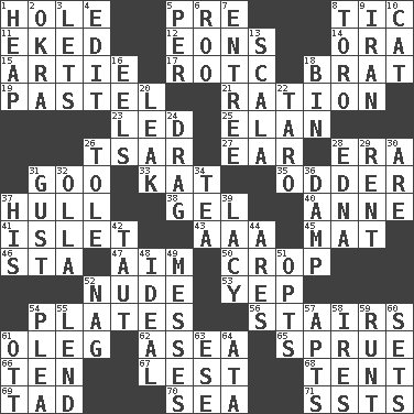 ACROSS 1. Opening into or through something 5. Before (prefix) 8. Nervous spasm 11. Supplemented with great effort 12. Immeasurably long periods of time 14. Mouth or opening 15. Nick name for Arthur 17. College mil. group 18. Naughty child 19. Soft color 21. Food allowance for one day 23. Directed 25. Liveliness 26. Russian ruler of old 27. Hearing organ 28. Epoch 31. Thick or sticky substance 33. Krazy ___ of comics 35. More peculiar 37. Frame or body of a ship 38. Set 40. Singer Murray 41. Small island 43. American Automobile Association (abbr.) 45. Floor covering 46. R.R. building 47. Direct toward a target or goal 50. Riding implement 52. Naked 53. Slangy assent 54. Food holders 56. Flight of steps 61. Cassini of fashion 62. Toward the sea 65. Disorder 66. "___ Little Indians" 67. For fear that 68. Portable shelter 69. Small boy 70. Ocean 71. Fast planes DOWN 1. Pile 2. Gumbo ingredient 3. Allows 4. Prepare for publication 5. For each 6. Friend of Pooh 7. Main course 8. "Corrida" creature 9. SW Asia republic 10. Feline 13. Any of the three canals of the cochlea 16. Snakelike fish 18. Storage container 20. Path through which fluid escapes 22. Edible starchy tuberous root 24. To be drawn or hauled along 26. Lacquered or enameled metalware 28. Pulitzer Prize-winning author Ferber 29. Monthly bill 30. "We ___ not amused" (Victoria) 31. Abrupt rush of wind 32. Rounded earthenware pot or jar 34. Beverage made from leaves 36. Moist 37. Part of HMS, perhaps 39. Made of lace 42. Pulled tight 44. Ancient Greek god of war 48. Standard of perfection 49. Makes clutter 51. Chooses 52. Tired old horse 54. Entreaty 55. Grant temporary use of 57. Tenement units (abbr.) 58. Angers 59. The smallest animal of a litter 60. Arranges properly for use 61. Baseball player Mel 63. Compass dir. 64. _ moment's notice (2 wds.)