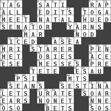 ACROSS 1. Label 4. Suttee (variant) 8. Reproach for some lapse or misdeed 11. Everything 12. Prepares for publication 14. Ancient Roman robe 15. Rendezvous 17. Brizilian seaport 18. Became colored 19. Elected representative 21. Entertaining tales 23. Third mo. 24. Lower and raise head in agreement 25. On the rocks 27. At sea 30. Medical imaging device (abbr.) 31. A viewer who gazes fixedly 34. Animal enclosure 37. Was introduced to 38. Off-Broadway awards 39. Adept person 40. Compass dir. 41. Makes clutter 43. Before (prefix) 44. Wig 45. Son of Isaac 47. Air pressure measure (abbr.) 49. Mountains (abbr.) 50. Seines 52. French poetic form 56. Allows 57. A salt of uric acid 60. Fly high 61. Hearing organs 62. Music written for nine 63. Compass dir. 64. Bear (Spanish) 65. Antes 66. Mayday DOWN 1. Scottish caps 2. Toward shelter 3. Small, secluded valley 4. Sir (Sp.) 5. The sixth month of the Jewish calendar 6. Teat (slang) 7. Call ___ day 8. Single shot of ammunition 9. Matures 10. Groovy apt. 13. Cunning 14. Through, poetically 16. Not wild 20. Small amounts or degrees 22. Santa ___, CA 25. Angers 26. Quote 27. Get up 28. Perceives with the eye 29. Celtic language 30. Madame (abbr.) 32. Heavy book 33. Collude with 34. Dad 35. Shade of tan 36. Born 42. Arranges properly for use 44. Shallow baking pan 46. Fast planes 47. Stone: prefix 48. Backtalk 49. Confronts 50. Oceans 51. Player for Phoenix 52. Proofreading order 53. Charged atoms 54. Billionth: prefix 55. Ancient Greek god of war 56. Lion 58. Director Reiner 59. One (Scot)