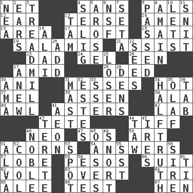 ACROSS 1. Fish or hair follower 4. Without 8. Friends 12. Hearing organ 13. Laconic 14. So be it 15. Type of rug 17. At or to great height 18. Suttee (variant) 19. Deli grouping 21. Help 23. June honoree 24. Set 26. Car or cant ending 27. Among 28. Wrote a lyric poem 30. Black tropical American cuckoo 31. Makes clutter 34. Being at a high temperature 37. Cartoonist voice _ Blanc 38. NE Netherlands city 39. Chicken ___ king 40. Leather borer 41. Michaelmas daisies 42. Experiment locale 43. False hair 44. Small quarrel 46. Modern: prefix 47. Distress signal 50. Tate display 51. Oak nuts 54. Replies (to) 57. Ear part 58. Mexican monetary units 60. Set or collection 62. Electrical Unit 63. Unconcealed 64. Three (prefix) 65. Toward shelter 66. Trial 67. Layer DOWN 1. Teachers' org. 2. Hearing organs 3. Excercise machine 4. Major League Baseball Commissioner Bud 5. Came up 6. Overdraft (abbr.) 7. Bristle 8. Went by 9. At full speed 10. Allows 11. In a ____ (agitated or irritated) 13. Scottish cap 16. Jai ____ 20. Find the sum of 22. Observes 25. Failure 27. Afresh 29. Lairs 30. Housemaid (var.) 31. Vertical spar for supporting sails 32. _____ Park, CO 33. Compass dir. 34. Not exactly gospel 35. Norwegian king 36. Bar bill 41. Period of immesurable duration 43. Cylindrical with tapered ends 44. The 23rd letter of the Hebrew alphabet 45. Angers 46. Having high moral qualities 48. Fertile tracts in a desert 49. Derisive sound 51. Inventor's middle name 52. Calm and collected 53. Specific locale 55. Fast jet (abbr.) 56. The founder of a family 59. First lady 61. Metal container