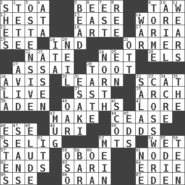 ACROSS 1. Portico 5. Fermented drink made from hops 9. The 23rd letter of the Hebrew alphabet 12. Behest 13. Relaxation 14. Had on 15. Singer James 16. Johnson of "Laugh-In" 17. Roberta Peters solo 18. Perceive with the eye 19. Indiana (abbr.) 21. Abalone 22. Nathan's nickname 24. Remaining after all deductions 26. Raised railways 27. Slender Brazilian palm 28. A blast of a horn 29. Deliberation 30. Memorize 32. Get outta here! 36. Moving, as bait 37. Fast jet (abbr.) 38. Bowlike part 39. An important port of Yemen 40. Profane or obscene expressions 42. Old wives' tales, e.g. 43. Cause to be 44. Stop 46. Compass dir. 49. RI univ. 50. Probability 51. Major League Baseball Commissioner Bud 53. Mountains (abbr.) 54. Dripping 57. Pulled tight 58. Mitch Miller's instrument 61. Connecting point 62. Extremities 63. Indian skirt 64. 4th largest of the Great Lakes 65. Compass dir. 66. NW Algerian seaport 67. Genesis locale DOWN 1. "______ My Girl" (Turtles hit) 2. Wig 3. Clearly or manifestly demonstrative 4. "One Day ___ Time" 5. Necklace unit 6. Ewer handle 7. Eastern Standard Time (abbr.) 8. Portuguese money of account (variant) 9. Singer Mel 10. Satellite of Uranus 11. Puts on (as clothing) 14. Armed conflict 19. Call ___ day 20. Famous astronaut Armstrong 21. Baseball player Mel 23. NE Netherlands city 24. Compass direction 25. Period of immesurable duration 27. Enthusiastic 28. Clothes sense 29. Chicken ___ king 31. 1973 Nobel Price Winner (Physics) Leo 32. Vegetable dish 33. What you're doing now 34. Measure of real estate 35. Definite Article 40. Rowing implement 41. Native of Scotland 43. Large cup 45. Begley and Asner 46. _____ Park, CO 47. Seines 48. Evade 52. It is 53. Count _ (2 wds.) 55. Singer Brickell 56. Adolescent 58. Bear (Spanish) 59. Oblong piece of solid material 60. Mouth or opening 61. Born