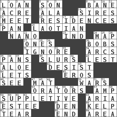 ACROSS 1. Grant temporary use of 5. Male offspring 8. Object of repulsion 12. Measure of real estate 13. In the manner of 14. Founders of families 15. Rendezvous 16. Dwellings 19. Baking dish 20. Of or relating to Laos or its people 21. Billionth: prefix 23. Indiana (abbr.) 24. Atlas unit 27. Washington bills 30. Moves up and down 31. Disregard 34. Arches 35. Baking dishes 38. Disparaging remarks 40. For fear that 41. Medicinal plant 42. Stop 44. Allows 45. Greek god of love 46. Perceive with the eye 47. Floor protector 50. Armed conflicts 53. Speakers 57. Electrical Unit 59. Supplying deficiencies 63. Operatic vocal solo 64. First name in cosmetics 65. Lair 66. Seaweed 67. Separate forcefully 68. Conclude 69. Type of rug DOWN 1. Desk light 2. Sea 3. Sports stadium 4. Fish or hair follower 5. "Two Mules for Sister ____" 6. Butter sub 7. Political cartoonist Thomas 8. Storage container 9. Curve 10. Born 11. Curvy letter 14. Post 17. One more than two 18. One of the 12 tribes of Israel 20. Having great length 22. Annoying sounds 24. Greater amount 25. Lettered men learn these first 26. Inconspicuous attention getter 28. Followers of ems 29. Disposed of to a purchaser 30. Greek mezzo-soprano Agnes 32. Sorrow 33. Celtic language 35. Friends 36. Toward shelter 37. Short letter 39. Title for a knight 43. Sty mamas 47. Undercover agent 48. "We ___ not amused" (Victoria) 49. Make lace 51. More uncommon 52. Grin 54. Event that recurs at intervals 55. Baking chamber 56. Tear apart 58. Dad 59. Arrange properly for use 60. Purpose 61. Parent Teacher Assoc. 62. For each 63. Alias (abbr.)