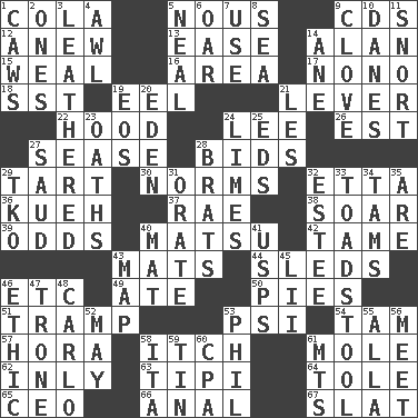 ACROSS 1. Root beer relative 5. Common sense 9. Music discs 12. Afresh 13. Comfort 14. Actor Alda or Thicke 15. Welt 16. Type of rug 17. Words to Nanette 18. Fast jet (abbr.) 19. Snakelike fish 21. Crowbar 22. Parka part 24. Area sheltered from the wind 26. Eastern Standard Time (abbr.) 27. Gospel singer Marvin 28. Auction offers 29. Small pie 30. Typical models 32. Singer James 36. Malaysian steamed pastry 37. Actress Charlotte 38. Fly high 39. Probability 40. Taiwanese island in East China Sea 42. Not wild 43. Floor protectors 44. Bobsleighs 46. And so on (abbr.) 49. Had dinner 50. Sliced desserts 51. _____ steamer (cargo ship) 53. 23rd letter of the Greek alphabet 54. Scottish cap 57. Israeli folk dance 58. Hankering 61. Undercover agent 62. Inwardly 63. Native american tent (variation) 64. Lacquered or enameled metalware 65. Corporate head (abbr.) 66. Of or related to the anus 67. Narrow board DOWN 1. Crow sounds 2. Singles 3. Tough but pliablecoriaceous 4. Leather borer 5. Actress Patricia 6. Boat paddle 7. Purpose 8. Ocean 9. Garlic unit 10. Natives or inhabitants of Denmark 11. Derisive sound 14. A saturated hydrocarbon 19. Greek goddess of the dawn 20. Genesis locale 21. French article 23. Expletives 24. Citrus fruits 25. Begley and Asner 27. Saudi Arabian king (1953-1964) 28. Naughty children 29. Ring climax 31. Speak pompously 32. First name in cosmetics 33. Inedible or poisonous agaric 34. Scottish caps 35. "We ___ not amused" (Victoria) 40. Floor protector 41. United States Postal Service (abbr.) 43. Atlas unit 45. Cards in a Roman deck? 46. Principle of right and wrong 47. Marketplace scale 48. Monte _, Las Vegas Hotel/Casino 52. Can I? 53. Silvers or Donahue 55. Silent film actress Nazimova 56. Confront 58. Call ___ day 59. Shallow baking pan 60. Accounting whiz (abbr.) 61. Mountains (abbr.)