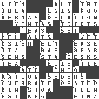 ACROSS 1. South Vietnam president (1954) 5. The first octave above the treble staff 8. Three (prefix) 11. It may be bright or harebrained 12. The front part of a cuirass 13. Friend of Pooh 14. Actresses Bloom and Felton 17. Accusation by an informer 19. Gossips 21. Foolish or stupid persons 22. Beverages made from leaves 23. Put into a specified state 24. Cartoonist voice _ Blanc 27. Pismires 29. Soggy 32. Flexible twig of a willow tree 34. Shade tree 36. Celtic language 37. Slanted text style (abbr.) 38. Actress Charlotte 39. Burn superficially 40. Elected reps. 41. R.R. building 42. Writing tables 43. Beverage made from leaves 44. Writer Wiesel 46. Neckwear 47. Had dinner 50. Information 52. Food allowance for one day 55. Spring feasts 57. Make much ado about nothing 59. Spoke pompously 62. Storage container 63. Portico 64. Adolescent 65. Eastern Standard Time (abbr.) 66. Barrel 67. Inactive volcano in Sicily DOWN 1. HTML Container Element 2. Binary compound 3. Suggestive of the supernatural 4. French painter Edouard 5. Ripen 6. Ms. Damita and namesakes 7. Sadhe (variant) 8. Musical group of three 9. Carrot, for example 10. Charged atoms 12. Begley and Asner 15. Approach 16. Comedian Laurel of Laurel & Hardy 18. Teat (slang) 20. Michaelmas daisies 24. Damp 25. First name in cosmetics 26. Woody, climbing, usually tropical plant 28. Chalkboard 29. Take or capture by force 30. 1973 Nobel Price Winner (Physics) Leo 31. Laconic 33. Raised railways 35. Ear of corn 36. Compass dir. 42. Put off 45. Southeast Asian peninsula 47. Wind 48. Cod relative 49. Related on the mother's side 51. Speak pompously 52. Loose flowing garment 53. Opinion 54. Portable shelter 55. Ocean 56. Proofreading order 58. Coat; cloak 60. Car or cant ending 61. Heredity factor (abbr.)