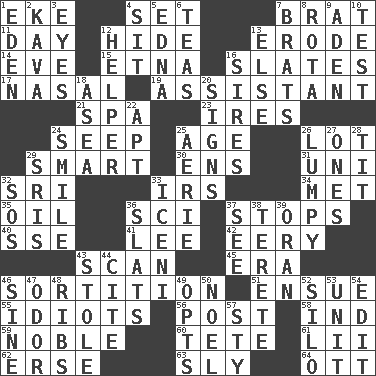 ACROSS 1. Make supply last 4. Put into a specified state 7. Naughty child 11. 24 hours 12. Flintstone garb 13. Eat (away) 14. Night before a holiday 15. Inactive volcano in Sicily 16. Chalkboards 17. Relating to the nose 19. Aide 21. Health resort 23. Angers 24. Ooze 25. Mature 26. Car dealer's back yard 29. Don Adams' spy role 30. Followers of ems 31. Single; one (prefix) 32. Indian title of respect (Mr.) 33. Big collection agency 34. Was introduced to 35. Lubricate 36. _-fi 37. Obstructs or blocks passage 40. Compass dir. 41. Area sheltered from the wind 42. Suggestive of the supernatural 43. Examine hastily 45. Epoch 46. Decision 51. Follow as a consequence or result 55. Foolish or stupid persons 56. Mail 58. Working for oneself (abbr.) 59. Having high moral qualities 60. Wig 61. Cards in a Roman deck? 62. Celtic language 63. Playfully artful 64. Baseball player Mel DOWN 1. Genesis locale 2. Polynesian shrub of the pepper family 3. Snake ____ (dice throw) 4. Be seated 5. Pulitzer Prize-winning author Ferber 6. Beverages made from leaves 7. Naughty children 8. Round or rotation of duties 9. An important port of Yemen 10. Trial 12. Assistant 13. Otherwise 16. Fathers 18. Toward the sea 20. Omens 22. Fitting 24. Grin 25. Nest on high 26. Containing lumps 27. Singles 28. Teat (slang) 29. Indian titles of respect 32. Distress signal 33. Ancient Celtic tribe of eastern Britain 36. Narrow boards 37. Observe 38. Cigar-shaped 39. NW Algerian seaport 43. Fur scarf 44. Quote 46. Trig term 47. Scent 48. Chest bones 49. Chooses 50. Christmas carol 52. Grain storage tower 53. A single undivided whole 54. Prepare for publication 57. Filthy place