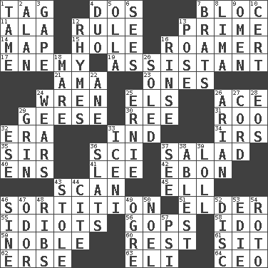 ACROSS 1. Label 4. Two (Sp.) 7. Group of countries in special alliance 11. Wing 12. General guideline 13. A-one 14. Atlas unit 15. Opening into or through something 16. Wanderer 17. Foe 19. Aide 21. Wet nurse (var.) 23. Singles 24. Songbird 25. Raised railways 26. Adept person 29. Honkers 30. To separate or throw off 31. Friend of Pooh 32. Period 33. Working for oneself (abbr.) 34. Big collection agency 35. Title for a knight 36. _-fi 37. First course 40. Followers of ems 41. Area sheltered from the wind 42. Inky black, to poets 43. Examine minutely or intensely 45. Pipe bend 46. Conclusion 51. A person who is older than you are 55. Foolish or stupid persons 56. Republicans 58. Wedding promise 59. Impressive in appearance 60. Repose 61. Be seated 62. Celtic language 63. Connecticut Ivy Leaguer 64. Corporate head (abbr.) DOWN 1. Docile 2. Actor Alda or Thicke 3. Open wide 4. Superhero pair 5. Rounded earthenware pot or jar 6. Perceives with the eye 7. Naughty children 8. Pale green bean 9. Sign of something about to happen 10. Foregone conclusion 12. Poems 13. Airs 16. Wash lightly 18. Female horse 20. Having a sole or soles 22. A saturated hydrocarbon 24. Puts on (as clothing) 25. Bert's buddy 26. Believer in; advocate of (suffix) 27. Drawstring 28. Greek goddess of the dawn 29. Amused look 32. Compass dir. 33. Ancient Celtic tribe of eastern Britain 36. Narrow boards 37. Perceive with the eye 38. Most capable 39. Hang loosely or laxly 43. Fur scarf 44. Quote 46. Trig term 47. Aroma 48. Teases 49. Legendary monster 50. Christmas carol 52. Compact _ 53. Singer Brickell 54. Printing process, for short 57. 23rd letter of the Greek alphabet