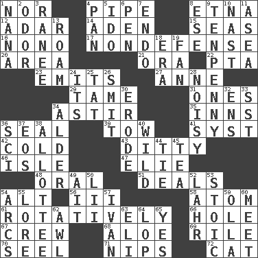 ACROSS 1. And not 4. Corncob 8. Inactive volcano in Sicily 12. The sixth month of the Jewish calendar 14. An important port of Yemen 15. Oceans 16. Words to Nanette 17. Unrelated to defense, as in spending 20. Type of rug 21. Mouth or opening 22. Parent Teacher Association (abbr.) 23. Gives off 27. Queen of England 1702-14 29. Docile 31. Singles 34. Having gotten out of bed 35. Restaurants 36. Lick closed 39. Pull behind 41. System (abbr.) 42. Chilled 43. Simple song 46. Small island 47. Writer Wiesel 48. Taken by mouth 51. Allots cards 54. The first octave above the treble staff 56. One more than two 58. Smallest unit of an element 61. Happening in regular succession 66. Hollow 67. Ship's personnel 68. Medicinal plant 69. Cause heat under the collar 70. Sew up the eyelids of hawks and falcons 71. Cuts off 72. Feline DOWN 1. Nanny 2. Scent 3. Indian princess (variant) 4. Baking dish 5. Wedding promise 6. Writing instrument 7. Inside; within (prefix) 8. Compass dir. 9. 3-inch nail 10. Political cartoonist Thomas 11. Toward the sea 13. Wander aimlessly 18. Epoch 19. Avid follower 24. ___ a Wonderful Life 25. Make lace 26. Stricken, poetically 28. Annoyingly loud 30. Eat (away) 32. Followers of ems 33. Fast jet (abbr.) 34. Tree or shrub in the Birch family 36. _-fi 37. Greek goddess of the dawn 38. One to whom something is allotted 40. Uncontrolled 44. Make a knot 45. Afternoon social gathering 49. Small island 50. Cards in a Roman deck? 52. Cowardly lion portrayer 53. Unemotional 54. Curves 55. Old wives' tales, e.g. 57. "Terrible" tsar 59. Water jar 60. Rendezvous 62. Leather borer 63. Biblical high priest 64. Trim (branches) 65. Affirmative reply