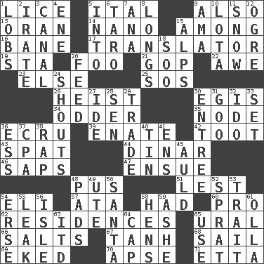 ACROSS 1. Louse (plural) 5. Slanted text style (abbr.) 9. In addition 13. NW Algerian seaport 14. Billionth: prefix 15. Amid 16. Object of repulsion 17. Interpreter 19. R.R. building 20. Egg _ yung 21. Republican Party 22. Deep reverence 23. Otherwise 25. Distress signal 26. Robbery 30. The front part of a cuirass 34. More peculiar 35. Connecting point 36. Shade of tan 39. Maternal 42. A blast of a horn 43. Argument over a trivial matter 44. Middle Eastern gold or silver currency 46. Plant excrements 47. Follow as a consequence or result 48. Product of festering 51. For fear that 54. Connecticut Ivy Leaguer 57. "One Day ___ Time" 58. Possessed 60. Adept person 62. Dwellings 65. Mountain range 66. Table seasonings 67. Hyperbolic tangent 68. Move on water 69. Supplemented with great effort 70. Domed church section 71. Singer James DOWN 1. Tennis shots 2. Feeling or showing extreme anger 3. Lessep's creation 4. Compass dir. 5. To the inside or interior of 6. Edible starchy tuberous root 7. Santa ___, CA 8. Yearns 9. Nanny (var.) 10. Globular water bottle used in Asia 11. Frozen precipitation 12. Legendary monster 15. High mountains 18. "Barney Miller" actor Jack 20. Nourish 24. Yells 27. Binary compound 28. Elected rep. 29. Swap 30. Main course 31. Thick or sticky substance 32. Wedding promise 33. Put into a specified state 36. Curvy letter 37. Numbers guy (abbr.) 38. Hit sharply and swiftly 40. Metal container 41. Followers of ems 45. Old (Scot.) 48. Writing tablets 49. Shoshoni 50. Before Barbara or Clara 52. Small fatty European fish 53. Distinguishing feature 54. Celtic language 55. Path through which fluid escapes 56. Small island 58. Coop moms 59. American tennis player Robert 61. Water jar 63. It would 64. Head covering 65. Purpose