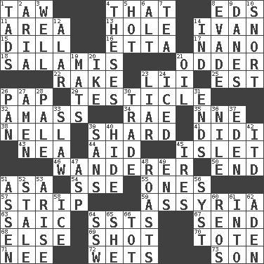 ACROSS 1. The 23rd letter of the Hebrew alphabet 4. Not this but _ 8. Begley and Asner 11. Length times width 13. Opening into or through something 14. "Terrible" tsar 15. Deli pickle 16. Singer James 17. Billionth: prefix 18. Deli grouping 21. More peculiar 22. Libertine 23. Cards in a Roman deck? 25. Eastern Standard Time (abbr.) 26. Infant food 29. A testis 32. Collect or gather 34. Actress Charlotte 35. Compass dir. 38. 1994 drama film starring Jodie Foster 39. Broken piece 41. "You Light Up My Life" star Conn 43. Teachers' org. 44. Help 45. Small island 46. Nomad 50. Conclude 51. White ___ sheet 54. Compass dir. 55. Singles 57. Empty completely 59. Nineveh was its capital 63. Ketch in the Levant 64. Fast planes 67. Post 68. Otherwise 69. Guess 70. Lug 71. Born 72. Moistens 73. Male child DOWN 1. Bits 2. Roberta Peters solo 3. Not ill 4. College papers 5. Being at a high temperature 6. Keyboard modifier key 7. Afternoon social gathering 8. Elude 9. Natives or inhabitants of Denmark 10. Derisive sound 12. Having or resembling wings 14. Indiana (abbr.) 19. Floor coverings 20. D.D.E's nickname 21. Petroleum 23. One who doesn't tell the truth 24. On the rocks 26. Baking dish 27. So be it 28. Light colored 30. Swap 31. Conclusions 33. Cole _ (cabbage dish) 36. Mediterranean tributary 37. Paradise 39. Without 40. Flintstone garb 42. It would 45. Angers 47. Cleo's killer 48. Cooks with dry heat, as in an oven 49. Followers of ems 51. NE Netherlands city 52. Having lost freshness 53. Ascend 56. System (abbr.) 58. Frozen water 60. Vintage cars 61. To the inside or interior of 62. An important port of Yemen 64. Compass dir. 65. A female animal or person 66. Small child