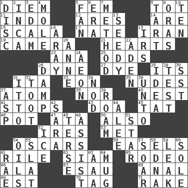 ACROSS 1. South Vietnam president (1954) 5. Opposite of masc. 8. Small child 11. _ china 12. Ancient Greek god of war 14. "We ___ not amused" (Victoria) 15. Any of the three canals of the cochlea 17. Nathan's nickname 18. SW Asia republic 19. Device for capturing images 21. Centers of feelings and intuitions 23. Santa ___, CA 25. Likelihood 26. Centimeter-gram-second unit of force 27. Color 28. It is 31. Call ___ day 33. A really long time 35. Unclothed pictures 37. Smallest unit of an element 38. Not either 40. Egg locale 41. Obstructs or blocks passage 43. ___ good deed 45. Make lace 46. Cooking vessel 47. _ moment's notice (2 wds.) 50. In addition 52. Angers 53. Was introduced to 54. Motion picture awards 56. Artist's stands 61. Cause heat under the collar 62. Thailand, formerly 65. Cowboy competition 66. Insect wing 67. Son of Isaac 68. Of or related to the anus 69. Eastern Standard Time (abbr.) 70. Label 71. Immoral or dissolute person DOWN 1. Plate 2. South American Indian 3. Dutch treat 4. Undercover agent 5. Air blower 6. Period 7. Mode 8. Small pie 9. Mouths or openings 10. Nine, plus one 13. Sleazy 16. Like ___ of sunshine 18. Big collection agency 20. Singer Murray 22. Arabian gulf 24. Period of immesurable duration 26. Moist 28. It may be bright or harebrained 29. Trial 30. Fast jet (abbr.) 31. "Tell ____ the Marines!" 32. A blast of a horn 34. Dreamland 36. To (old English) 37. Cleo's killer 39. Wander 42. "Two Mules for Sister ____" 44. Toward shelter 48. Laconic 49. Help 51. Play the lead 52. Frozen water 54. Petroleums 55. Narrow board 57. Fly high 58. Pulitzer Prize-winning author Ferber 59. Path through which fluid escapes 60. Not divided or shared with others 61. Actress Charlotte 63. Auto club (abbr.) 64. Large cup