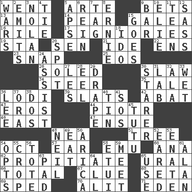 ACROSS 1. Gone 5. Johnson of "Laugh-In" 9. Antes 13. Mine, in Marseilles 14. Lightbulb-shaped fruit 15. An organ shaped like a helmet 16. Cause heat under the collar 17. Seigniories (variant) 19. R.R. building 20. Elected rep. 21. Binary compound 22. Followers of ems 23. Fastener 25. Greek goddess of the dawn 26. Having a sole or soles 30. Cole _ (cabbage dish) 34. Guide 35. Lie 36. Farming town in central California 39. Narrow boards 42. Blind as ____ 43. Greek god of love 44. Peter (Polish) 46. Compass direction 47. Take place subsequently 48. Teachers' org. 51. Relationship diagram 54. Sep. follower 57. Ewer handle 58. Australian flightless bird 60. Santa ___, CA 62. Appease 65. Mountain range 66. "_____ Recall" 67. A slight indication 68. Bristle 69. Drove too fast 70. Came down and settled, as after flight 71. Paradise DOWN 1. Armed conflicts 2. Gives off 3. Pitcher Ryan 4. Standoff 5. Domed church section 6. It's straight from the horse's mouth 7. Label 8. Bert's buddy 9. Drinking establishment 10. Writer Wiesel 11. Adolescent 12. Backtalk 15. Travels 18. Wedding promise 20. Blemish 24. Help 27. French article 28. Snakelike fish 29. Window treatment 30. A viewer who gazes fixedly 31. Experiment locale 32. Insect wing 33. Dripping 36. Area sheltered from the wind 37. Mouth or opening 38. Two (Sp.) 40. Shallow baking pan 41. Distress signal 45. Ballerina skirt 48. Famous astronaut Armstrong 49. Erode 50. N. Chile seaport 52. Having ears or earlike features 53. Maternal 54. Elects 55. Riding implement 56. Carry 58. Needle case 59. Rendezvous 61. Actor Alda or Thicke 63. Writing tablet 64. 100% 65. Purpose