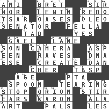 ACROSS 1. Black tropical American cuckoo 4. Cy Young winner Saberhagen 8. Title for a knight 11. Not either 12. Soviet premier 1918-24 14. Make new 15. Russian ruler of old 17. Fertile tracts in a desert 18. Butter sub 19. Elected representative 21. Man or boy (slang) 23. Small boy 24. It is so 25. Highlander 27. Unable to walk 30. Boy, to dad 31. Device for capturing images 34. Viper 37. Car or cant ending 38. All-night dance parties 39. Heredity factor (abbr.) 40. Compass dir. 41. Make 43. One of the 12 tribes of Israel 44. "Mermaids" star 45. Cook's measure (abbr.) 47. Grow older 49. Parent Teacher Assoc. 50. Soup utensil 52. Separating forcefully 56. Halt 57. Constellation of myth 60. Move through with a circular motion 61. Hearing organs 62. Make _____ (do battle with) 63. Chicken ___ king 64. Nonscientific branch of learning 65. Friends 66. French article DOWN 1. Pismires 2. Sense of smell 3. SW Asia republic 4. Vital fluid 5. Bring up, as a child 6. Followers of ems 7. Standoff 8. Makes a sale 9. The content of cognition 10. Friend of Pooh 13. Overdraft (abbr.) 14. Hero or heavy, e.g. 16. Assign a rank or rating to 20. Baby powder 22. Sight organ 25. Travels 26. Singer Murray 27. Crowbar 28. Type of rug 29. Vertical spar for supporting sails 30. Observe 32. Bowlike part 33. Female horse 34. Does sums 35. Fastener 36. Baking dish 42. Singer James 44. Corporate head (abbr.) 46. Drinking establishments 47. To the left, to Queeg 48. Republicans 49. Actor Sean's family 50. Play the lead 51. Immediately 52. Utensil 53. Slanted text style (abbr.) 54. "Death on the ____" 55. Pate de foie ____ 56. Ocean 58. Reproach for some lapse or misdeed 59. Lyricist Gershwin