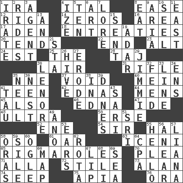 ACROSS 1. Lyricist Gershwin 4. Slanted text style (abbr.) 8. Comfort 12. Capital of Latvia 14. Nothings 16. Type of rug 17. Arabian gulf 18. Pleas 20. Looks after 22. Conclude 23. The first octave above the treble staff 24. Eastern Standard Time (abbr.) 25. Definite Article 28. _ Mahal 30. Den 31. Ransack; plunder; pillage 35. Compass dir. 37. Empty area or space 40. Chow _ 41. Adolescent 42. Ferber et al. 44. Not women's 45. In addition 46. Pulitzer Prize-winning author Ferber 47. Binary compound 48. Extremist 50. Celtic language 52. Compass dir. 54. Title for a knight 55. Actor Linden 58. Bear (Spanish) 61. Boat paddle 63. Ancient Celtic tribe of eastern Britain 65. Frustrating wastes of time 70. Entreaty 71. Silent film actress Nazimova 72. Vertical member of a panel or frame 73. ____ Jay Lerner 74. Ooze 75. Capital of Western Samoa 76. Mouth or opening DOWN 1. Feeling or showing extreme anger 2. Amusement-park features 3. Representative 4. Ending with capital 5. Nine, plus one 6. Tate display 7. Old wives' tales, e.g. 8. Consume 9. Operatic vocal solo 10. Sew up the eyelids of hawks and falcons 11. 90 degrees 13. Also 15. Posted 19. The sixth month of the Jewish calendar 21. R.R. building 26. Hub of activity 27. Eat (away) 29. Stevie Ray Vaughan's brother 30. Poe poem 32. Nourish 33. Actor's bit 34. Followers of ems 35. 1994 drama film starring Jodie Foster 36. A home for chicks 38. Indiana (abbr.) 39. Natives or inhabitants of Denmark 41. The 19th letter of the Greek alphabet 43. Indian skirt 49. Small Philippine buffalo 51. Indian title of respect (Mr.) 53. Hearing organs 55. Phone greeting 56. Approach 57. Woody, climbing, usually tropical plant 58. Mouths or openings 59. Drop; flow; fall 60. Stare 62. Round or rotation of duties 64. Tax preparer (abbr.) 66. Atlas unit 67. Mouth edge 68. Biblical high priest 69. Ocean