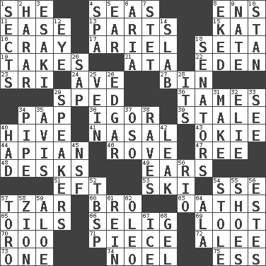 ACROSS 1. A female animal or person 4. Oceans 8. Followers of ems 11. Relaxation 13. Components 15. Krazy ___ of comics 16. Supercomputer manufacturer 17. Satellite of Uranus 18. Bristle 19. Proceeds 21. "One Day ___ Time" 22. Locale of original sin 23. _ Lanka 24. "___ Maria" 27. Storage container 29. Broke a traffic law 30. Softens 34. Infant food 36. Composer Stravinsky 39. Showing deterioration from age 40. Hub of activity 41. Rhinal 43. Migrant worker of the '30s 44. Bee-related 46. Be footloose 47. To separate or throw off 48. Writing tables 49. Hearing organs 51. Newt 53. What Jean-Claude Killy likes to do 54. Compass dir. 57. Russian ruler 60. Sis' sibling 63. Expletives 65. Lubricates 66. Former Milwaukee Brewers owner Bud 69. Plunder 70. Friend of Pooh 71. Part 72. Toward shelter 73. Single 74. Christmas carol 75. Curvy letter DOWN 1. Religious groups 2. Ethiopian city, capital of Harari 3. 1973 Nobel Price Winner (Physics) Leo 4. Health resort 5. Hearing organ 6. Roberta Peters solo 7. Proofreading order 8. Made supply last 9. Nathan's nickname 10. Comedian Laurel of Laurel & Hardy 12. Sight organ 14. Thick slice 18. Legislators 20. Plant excrement 25. Distinctive style or manner 26. _ Allan Poe 28. It is 29. Orators 31. Cause to be 32. Writer Wiesel 33. Perceive with the eye 34. Corncob 35. Opinion 37. Bear (Spanish) 38. All-night dance parties 40. Possessed 42. Path through which fluid escapes 45. Science/research agcy. 50. River (Sp.) 52. Cook's measure (abbr.) 54. Took without asking 55. Imelda's hoard 56. _____ Park, CO 57. "Corrida" creature 58. The Jewish people; Israel 59. Medicinal plant 61. It's straight from the horse's mouth 62. Butter sub 64. Chicken ___ king 67. Frozen water 68. Set