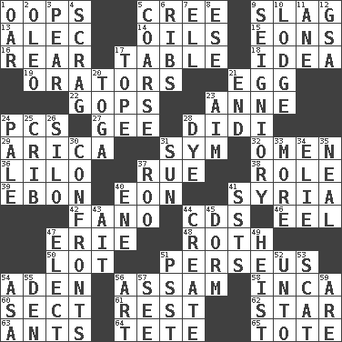 ACROSS 1. I made a mistake 5. Algonquian 9. Volcanic refuse 13. Actor Baldwin 14. Lubricates 15. Immeasurably long periods of time 16. Located in or toward the back 17. Eating place 18. The content of cognition 19. Speakers 21. Oval reproductive body of a fowl 22. Republicans 23. Singer Murray 24. Personal Computers (abbr.) 27. Unit of force equal to gravity 28. "You Light Up My Life" star Conn 29. N. Chile seaport 31. Symbol (abbr.) 32. Sign of something about to happen 36. _ and Stitch 37. Sorrow 38. Hero or heavy, e.g. 39. Inky black, to poets 40. A really long time 41. Damascus' land 42. Papal veil 44. Music discs 46. Snakelike fish 47. 4th largest of the Great Lakes 48. Writer of Portnoy's Complaint (1969) 50. Car dealer's back yard 51. Son of Zeus who helped slay Medusa 54. An important port of Yemen 56. Indian state 58. South American Indian 60. Religious group 61. Respite 62. Play the lead 63. Pismires 64. Wig 65. Carry DOWN 1. Boat paddle 2. Margarine 3. Lightbulb-shaped fruit 4. Lean end of the neck 5. Unrefined 6. Chest bones 7. Pipe bend 8. Compass dir. 9. Signiory (variant) 10. Cabin 11. One (Scot) 12. Girls' org. (abbr.) 17. Drink excessively 20. Ancient Roman robe 21. Conclusion 23. Direct toward a target or goal 24. Diluted with white 25. Baby bed with high sides 26. Grain storage tower 28. Color 30. Meets 31. Player for Phoenix 33. Greater amount 34. Writer Wiesel 35. Be tempered by heat 37. Friend of Pooh 40. Compass dir. 41. Fast planes 43. Small island 44. Make 45. Dormintory (informal) 47. Choose 49. Robbery 51. Inconspicuous attention getter 52. To (old English) 53. Get outta here! 54. White ___ sheet 55. Lair 56. Nonscientific branch of learning 57. Perceive with the eye 59. "We ___ not amused" (Victoria)