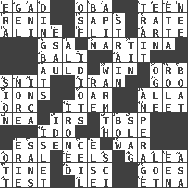 ACROSS 1. Mild oath 5. Chief or king in Benin or Nigeria 8. Adolescent 12. Painter Guido (1575-1642) 13. Plant excrements 15. Assign a rank or rating to 16. Place in a line 18. Sudden quick movement 19. Johnson of "Laugh-In" 20. Girls' org. (abbr.) 22. Chrissie's court nemesis 24. Indonesian resort city 26. Small island 27. Old (Scot.) 28. Victory 29. Globe 32. Stricken, poetically 35. SW Asia republic 37. Thick or sticky substance 38. Charged atoms 39. Boat paddle 40. Silent film actress Nazimova 41. The grampus (Milton) 42. Detail 43. Confront 44. Teachers' org. 45. Big collection agency 46. Cook's measure (abbr.) 49. Wedding promise 50. Hollow 51. Core 55. Armed conflict 56. Of the mouth 57. Snakelike fish 59. An organ shaped like a helmet 63. Prong on a fork 64. Compact _ 65. Moves 66. Trial 67. Luau accessory 68. Inactive volcano in Sicily DOWN 1. Epoch 2. Set 3. Black tropical American cuckoo 4. Empty-headed or silly people 5. Order of Saint Francis (abbr.) 6. Lip ointment 7. Capital of Western Samoa 8. Distinguishing feature 9. Merit 10. Singer James 11. Born 14. Put through a sieve 17. He sold his birthright 21. 100% 23. Shallow baking pan 25. Foolish or stupid persons 28. Heat 29. Stare 30. Hero or heavy, e.g. 31. Water vessel 32. The Jewish people; Israel 33. Greater amount 34. South American Indian 36. Actress Charlotte 40. Electrical Measurement 42. Pressed 45. Binary compound 47. Arrow shooter 48. Volcanic refuse 49. Small island 51. One of the Great Lakes 52. Without 53. To provide with a ceiling 54. Otherwise 56. Baseball player Mel 58. _-fi 60. Car dealer's back yard 61. Car or cant ending 62. White ___ sheet