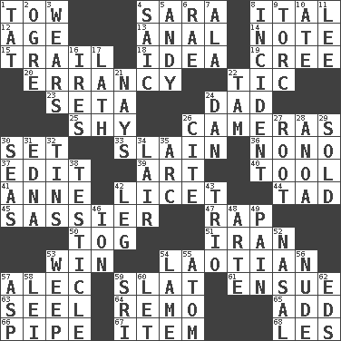 ACROSS 1. Pull behind 4. "Two Mules for Sister ____" 8. Slanted text style (abbr.) 12. Grow older 13. Of or related to the anus 14. Short letter 15. Drop behind 18. The main thing one is thinking about 19. Algonquian 20. Tendancy to err 22. Nervous spasm 23. Stalk of a moss capsule 24. June honoree 25. Like a shrinking violet 26. Devices for capturing images 30. Put into a specified state 33. Killed 36. Words to Nanette 37. Prepare for publication 39. Nonscientific branch of learning 40. Instrument 41. Singer Murray 42. It is permitted: Lat. 44. Small boy 45. More lively and spirited 47. Hit sharply and swiftly 50. Coat; cloak 51. SW Asia republic 53. Acquire through effort 54. Of or relating to Laos or its people 57. Actor Baldwin 59. Narrow board 61. Take place subsequently 63. Sew up the eyelids of hawks and falcons 64. San ____ (Riviera town) 65. Say or write further 66. Corncob 67. Detail 68. French article DOWN 1. Make lace 2. Legendary monster 3. Erodes 4. Ketch in the Levant 5. "60 Minutes" Commentator Rooney 6. Actress Charlotte 7. In the manner of 8. Event 9. Torque (variant) 10. Had dinner 11. Area sheltered from the wind 16. Angers 17. Thin strip of wood or metal 21. Negative votes 22. Scottish cap 24. Daniel's nick name 26. Quote 27. Carrot, for example 28. Small Philippine buffalo 29. Disposed of to a purchaser 30. Oceans 31. Pulitzer Prize-winning author Ferber 32. Airtight sealed metal containers 34. Den 35. Curve 38. One of the two male reproductive glands 42. Part of a journey 43. Musical group of three 46. Electrically charged atom 48. Johnson of "Laugh-In" 49. Ache 52. Rhinal 53. Shed a tear 54. Unable to walk 55. Tiny particle 56. Unadorned 57. Cleo's killer 58. Luau accessory 59. _ Lanka 60. Allow 62. Begley and Asner