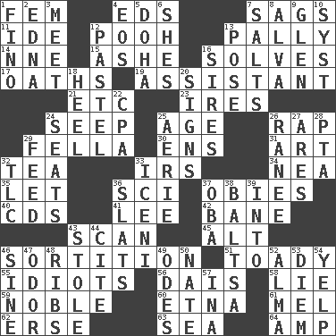 ACROSS 1. Opposite of masc. 4. Begley and Asner 7. Settles 11. Binary compound 12. "Silly old bear" 13. Chummy 14. Compass dir. 15. American tennis player Robert 16. Finds the solution 17. Profane or obscene expressions 19. Aide 21. And so on (abbr.) 23. Angers 24. Ooze 25. Personal question 26. Reproach for some lapse or misdeed 29. Chap (slang) 30. Followers of ems 31. Nonscientific branch of learning 32. Beverage made from leaves 33. Big collection agency 34. Teachers' org. 35. Allow 36. _-fi 37. Off-Broadway awards 40. Music discs 41. Area sheltered from the wind 42. Object of repulsion 43. Examine minutely or intensely 45. Keyboard modifier key 46. Decision 51. Sycophant 55. Foolish or stupid persons 56. Raised platform 58. Untruth 59. Having high moral qualities 60. Inactive volcano in Sicily 61. Cartoonist voice _ Blanc 62. Celtic language 63. Ocean 64. Electrical Unit DOWN 1. Fine (Spanish) 2. Pulitzer Prize-winning author Ferber 3. Rendezvous 4. Greek goddess of the dawn 5. Capital of the state of Qatar 6. "______ My Girl" (Turtles hit) 7. Table seasonings 8. Inventor's middle name 9. Small, secluded valley 10. System (abbr.) 12. Soft color 13. Airs 16. Male parents of animals 18. Person who is morally reprehensible 20. Attaches a signature 22. Numbers guy (abbr.) 24. Theater features 25. Nest on high 26. Indian princess (variant) 27. Ancient Greek god of war 28. Parent Teacher Assoc. 29. Nourish 32. Affectionate concern, for short 33. Ancient Celtic tribe of eastern Britain 36. Narrow boards 37. Chief or king in Benin or Nigeria 38. Greek mezzo-soprano Agnes 39. To the inside or interior of 43. Fur scarf 44. Quote 46. Trig term 47. Scent 48. Teases 49. Lyric poems 50. Nathan's nickname 52. _ mater 53. South Vietnam president (1954) 54. Sharp bark 57. _ tizzy (2 wds.)