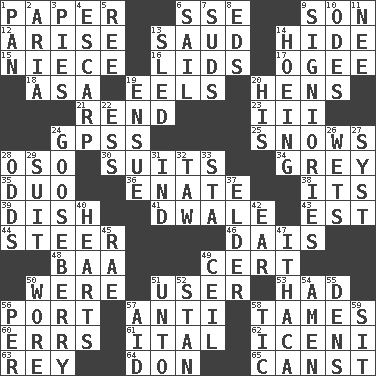 ACROSS 1. Some stationery 6. Compass dir. 9. Male child 12. Ascend 13. Saudi Arabian king (1953-1964) 14. Flintstone garb 15. Sibling's daughter 16. Flaplike coverings 17. Double curve, resembling the letter S 18. White ___ sheet 19. Snakelike fish 20. Coop moms 21. Tear apart 23. One more than two 24. Global Positioning Systems (abbr.) 25. Frozen precipitation (plural) 28. Bear (Spanish) 30. Costumes for special activities 34. Jennifer or Joel 35. Superhero pair 36. Related on the mother's side 38. It is 39. Food container 41. A sleeping potion; an opiate (poet.) 43. Eastern Standard Time (abbr.) 44. Bull 46. Raised platform 48. Sound made by sheep 49. Certainty 50. We are 51. One who uses or employs something 53. Possessed 56. Sweet dark-red dessert wine 57. Against 58. Softens 60. Blunders 61. Slanted text style (abbr.) 62. Ancient Celtic tribe of eastern Britain 63. Marina Del _, California 64. Spanish title 65. 2nd pers. sing. pres. of can (arch.) DOWN 1. Baking dish 2. Operatic vocal solo 3. Sliced desserts 4. Fortification 5. To separate or throw off 6. Travel by water 7. Soap bubbles 8. Begley and Asner 9. Seigniories (variant) 10. Lyric poems 11. Born 13. Downhill vehicle 14. Weeding 19. Take place subsequently 20. Part of HMS, perhaps 22. Curvy letter 24. Sour, prickly fruit 26. Moistens 27. System (abbr.) 28. Probability 29. Costume for a special activity 31. Working for oneself (abbr.) 32. The 23rd letter of the Hebrew alphabet 33. R.R. building 37. A person who is older than you are 40. Centers of feelings and intuitions 42. Hearing organ 45. Actress Charlotte 47. New York city 49. To provide with a ceiling 50. Had on 51. To (old English) 52. Comedian Laurel of Laurel & Hardy 54. So be it 55. Hiding places for outlaws 56. For each 57. Help 58. Nervous spasm 59. Be seated