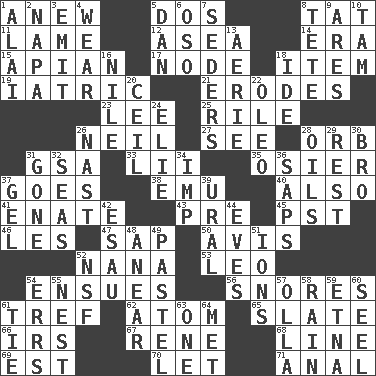 ACROSS 1. Afresh 5. Two (Sp.) 8. Make lace 11. Unable to walk 12. Toward the sea 14. Epoch 15. Bee-related 17. Thickened enlargement 18. A distinct part 19. Of or pertaining to medicine 21. Eats (away) 23. Area sheltered from the wind 25. Cause heat under the collar 26. Famous astronaut Armstrong 27. Perceive with the eye 28. Globe 31. Girls' org. (abbr.) 33. Cards in a Roman deck? 35. Flexible twig of a willow tree 37. Travels 38. Australian flightless bird 40. In addition 41. Maternal 43. Before (prefix) 45. Pacific Standard Time (abbr.) 46. French article 47. Plant excrement 50. Opinion 52. Grandmother 53. Lion 54. Follows as a consequence or result 56. Sounds asleep 61. Unclean, religiously 62. Smallest unit of an element 65. Chalkboard 66. Big collection agency 67. French philosopher Descartes 68. Actor's bit 69. Eastern Standard Time (abbr.) 70. Allow 71. Of or related to the anus DOWN 1. Jai ____ 2. California wine valley 3. Give off 4. Erode 5. Daniel's nick name 6. Bear (Spanish) 7. Spring feasts 8. Wig 9. Ancient Greek god of war 10. Scottish cap 13. Nest on high 16. "Death on the ____" 18. Binary compound 20. To provide with a ceiling 22. Margarine 24. Writer Wiesel 26. Political cartoonist Thomas 28. Lubricates 29. Remainder 30. Sis' sibling 31. Went 32. Oceans 34. Mischievous child 36. Plant excrements 37. Set 39. Mountain range 42. He sold his birthright 44. Nights before holidays 48. Approach 49. Soft color 51. Charged particles 52. Science/research agcy. 54. Blunders 55. Egg locale 57. Spanish pot 58. Water falling in drops from the sky 59. Inactive volcano in Sicily 60. Stitch closed the eyes of (a falcon) 61. Standoff 63. Single 64. Was introduced to