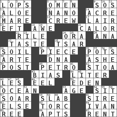 ACROSS 1. Chops off 5. Sign of things to come 9. Distress signal 12. _ vera 13. Billionth: prefix 14. 43,560 square feet 15. Female horse 16. Group working together 17. Den 18. Lizard (obsolete) 19. Deep reverence 21. Bodily heat indicating an inflammation 22. Cause heat under the collar 24. Mouth or opening 26. Santa ___, CA 27. Clothes sense 28. Russian ruler of old 29. Land 30. Component 32. Plant holders 36. Johnson of "Laugh-In" 37. Heredity factor (abbr.) 38. American tennis player Robert 39. Mail 40. Stone: prefix 42. Portico 43. Prejudice 44. 61 cubic inches 46. French article 49. Snakelike fish 50. Genesis locale 51. Sea 53. Mature 54. Be seated 57. Fly high 58. Broad, flat, thick piece 61. Beget 62. Otherwise 63. Torque (variant) 64. _ the terrible 65. To separate or throw off 66. Tenement units (abbr.) 67. Monthly bill DOWN 1. Unable to walk 2. Norwegian king 3. Likenesses of persons 4. Perceive with the eye 5. Single time 6. Spoil 7. Compass dir. 8. At this time 9. Any of the three canals of the cochlea 10. Constellation of myth 11. Spanish missionary in California 14. Wing 19. Keyboard modifier key 20. Shed a tear 21. 4-wheeled motor vehicle 23. Small island 24. Witty Wilde 25. Actress Charlotte 27. "Corrida" creature 28. Portable shelters 29. Plant excrement 31. Standard of perfection 32. Thick mixture 33. Clearly or manifestly demonstrative 34. Son of Odin 35. Ocean 40. Sliced dessert 41. Cassini of fashion 43. Benjamin's nick name 45. Binary compound 46. Failure 47. Learning spot: Fr. 48. Gospel singer Marvin 52. "We ___ not amused" (Victoria) 53. Lettered men learn these first 55. SW Asia republic 56. Portable shelter 58. R.R. building 59. Trim (branches) 60. Tate display 61. Title for a knight