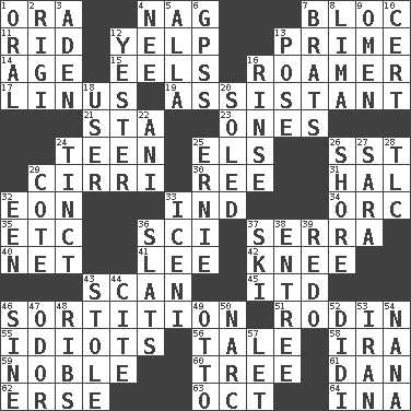 ACROSS 1. Mouth or opening 4. Tired old horse 7. Coalition 11. To free from 12. Sharp bark 13. A-one 14. Grow older 15. Snakelike fish 16. Nomad 17. "_ and Lucy" (Charlie Brown theme song) 19. Aide 21. R.R. building 23. Washington bills 24. Adolescent 25. Raised railways 26. Fast jet (abbr.) 29. High-altitude cloud 30. To sift 31. Actor Linden 32. A really long time 33. Indiana (abbr.) 34. The grampus (Milton) 35. And so on (abbr.) 36. _-fi 37. Father Junipero _ 40. Remaining after all deductions 41. Area sheltered from the wind 42. Leg joint 43. Examine minutely or intensely 45. It would 46. Casting lots 51. "The Thinker" sculptor 55. Foolish or stupid persons 56. Falsehood 58. Retirement account (abbr.) 59. Having high moral qualities 60. Family _ (genealogy) 61. Daniel's nick name 62. Celtic language 63. Sep. follower 64. _ tizzy (2 wds.) DOWN 1. Taken by mouth 2. Swiss mountan, "Queen of the Mountains" 3. An important port of Yemen 4. Born 5. Silent film actress Nazimova 6. Global Positioning Systems (abbr.) 7. Naughty children 8. Pale green bean 9. Sign of something about to happen 10. An absolute certainty 12. Of or pertaining to yesterday 13. Airs 16. Remove soap 18. One who uses or employs something 20. Having a sole or soles 22. Black tropical American cuckoo 24. Colored lightly or faintly 25. Bert's buddy 26. Dinah or Pauly 27. "Two Mules for Sister ____" 28. Affectionate concern, for short 29. ____ d'Azur (French Riviera) 32. Car or cant ending 33. Ancient Celtic tribe of eastern Britain 36. Narrow boards 37. What Jean-Claude Killy likes to do 38. Main course 39. Do over again 43. Fur scarf 44. Quote 46. Trig term 47. Scent 48. Chest bones 49. Von Bismarck 50. Drug cop 52. "You Light Up My Life" star Conn 53. SW Asia republic 54. Nanny 57. Allow