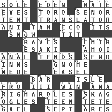 ACROSS 1. Flatfish 5. Paradise 9. Nathan's nickname 13. Nights before holidays 14. "Corrida" creature 15. Sir (Sp.) 16. Portable shelter 17. Interpreter 19. Cuckoo 20. Scottish cap 21. Environmental prefix 22. It is 23. Overwhelm 25. Teat (slang) 26. All-night dance parties 30. Independent ruler or chieftain 34. 1973 Nobel Price Winner (Physics) Leo 35. Mine, in Marseilles 36. Of or related to the anus 39. Looks after 42. Transmit 43. Taverns 44. Dwarf 46. Ancient Persian 47. Artist's stand 48. Drinking establishment 51. Capri or Wight 54. From 57. One more than two 58. Acquire through effort 60. Santa ___, CA 62. Frustrating wastes of time 65. Heroin 66. Stares 67. Adolescent 68. False hair 69. Highlander 70. Back-to-school mo. 71. Ancient Greek god of war DOWN 1. Stalk of a moss capsule 2. Baking chambers 3. Soviet premier 1918-24 4. Eastern Standard Time (abbr.) 5. Singer James 6. Dormintory (informal) 7. Epoch 8. Music written for nine 9. Teachers' org. 10. Opposed to 11. A blast of a horn 12. Blunders 15. Narrow opening 18. _-fi 20. It was, poetically 24. Threatening words 27. Large container 28. Make supply last 29. Burn superficially 30. Artist's stands 31. Madame (abbr.) 32. Electrically charged atom 33. To free from 36. Direct toward a target or goal 37. Compass dir. 38. Plus 40. Heredity factor (abbr.) 41. Distress signal 45. Count _ (2 wds.) 48. Prejudice 49. Wind 50. Debaucheries 52. Member of a famous L.A. basketball team 53. Related on the mother's side 54. Tree-dwelling hopper 55. Port city in Latvia 56. Stare 58. Shed a tear 59. Is not 61. Grows older 63. Cartoonist voice _ Blanc 64. Area sheltered from the wind 65. R.R. building