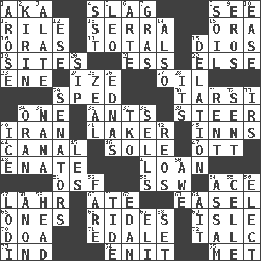 ACROSS 1. Alias (abbr.) 4. Volcanic refuse 8. Perceive with the eye 11. Cause heat under the collar 13. Father Junipero _ 15. Mouth or opening 16. Mouths or openings 17. Add up to 18. "Vaya con ____" 19. Settings 21. Double-curved letter 22. Otherwise 23. Compass dir. 24. Ending with capital 27. Petroleum 29. Moved rapidly 30. Tarsus (plural) 34. Single 36. Pismires 39. Guide 40. SW Asia republic 41. Member of a famous L.A. basketball team 43. Restaurants 44. Lessep's creation 46. Flatfish 47. Baseball player Mel 48. Maternal 49. Grant temporary use of 51. Order of Saint Francis (abbr.) 53. Compass dir. 54. Adept person 57. Cowardly lion portrayer 60. Had dinner 63. Artist's stand 65. Washington bills 66. Amusement-park features 69. Small island 70. ___ good deed 71. Peak District village in England 72. Baby powder 73. Indiana (abbr.) 74. Send forth 75. Was introduced to DOWN 1. Came up 2. Japanese brewing company 3. Having winglike extensions 4. Fast jet (abbr.) 5. Lion 6. Johnson of "Laugh-In" 7. Pate de foie ____ 8. The visible part of the earth's surface 9. Greek god of love 10. Relaxation 12. Compass dir. 14. In addition 18. Conveyance 20. Small drink 25. Ardor 26. Ferber et al. 28. It is 29. Elected representatives 31. Monthly bill 32. Posted 33. Big collection agency 34. NW Algerian seaport 35. Grandmother 37. Ring climax 38. Exchanges for money 40. Frozen water 42. Vintage cars 45. French article 50. Deep reverence 52. Conductor's collection 54. Indian state 55. Cell (Danish) 56. Opt 57. Farming town in central California 58. Soon (poet.) 59. Froth on beer 61. Periodic rise and fall of the sea level 62. Dutch treat 64. Small island 67. Connecticut Ivy Leaguer 68. Put into a specified state