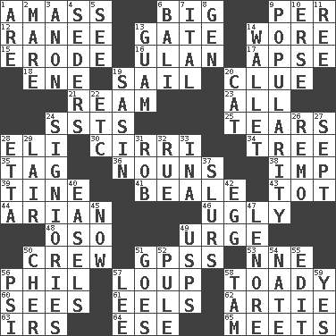 ACROSS 1. Collect or gather 6. Of large size 9. For each 12. Indian princess (variant) 13. Yard entry 14. Had on 15. Eat (away) 16. ____ Bator, Mongolia 17. Domed church section 18. Compass dir. 19. Travel by water 20. A slight indication 21. 480, 500 or 516 sheets of paper 23. Everything 24. Fast planes 25. Lacerates 28. Biblical high priest 30. High-altitude cloud 34. Family _ (genealogy) 35. Label 36. Parts of speech 38. Naughty child 39. Prong on a fork 41. Calif. Air Force Base 43. Small child 44. Believer in; advocate of (suffix) 46. Unsightly 48. Bear (Spanish) 49. Goad 50. Group working together 51. Global Positioning Systems (abbr.) 53. Compass dir. 56. Silvers or Donahue 57. Central Nebraska county 58. Sycophant 60. Perceives with the eye 61. Snakelike fish 62. Nick name for Arthur 63. Big collection agency 64. Compass dir. 65. Confronts DOWN 1. "We ___ not amused" (Victoria) 2. Female horse 3. Soon (poet.) 4. Spring feasts 5. Observe 6. Indonesian resort city 7. Slanted text style (abbr.) 8. Commissioned mil. rank 9. Teen's desire 10. Celtic language 11. Portuguese money of account (variant) 13. Island territory of the United States 14. Place for singles 19. Indian antelope 20. Domesticated feline 22. And so on (abbr.) 24. Seigniories (variant) 26. San ____ (Riviera town) 27. Back-to-school mo. 28. Singer James 29. Den 31. Director Reiner 32. Sorrow 33. _ tizzy (2 wds.) 37. Plays smoothly or legato 40. Artist's stands 42. Oval reproductive body of a fowl 45. At this time 47. Poe poem 49. United States Postal Service (abbr.) 50. "Mermaids" star 51. Moves 52. Whine 54. Nathan's nickname 55. Prepare for publication 56. 23rd letter of the Greek alphabet 57. Area sheltered from the wind 58. Scottish cap 59. Consenting reply
