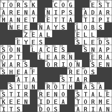 ACROSS 1. Cod relative 6. Gear tooth 9. Eastern Standard Time (abbr.) 12. Sports stadium 13. Cuts off 14. The sixth month of the Jewish calendar 15. French painter Edouard 16. Singer James 17. Native american tent (variation) 18. Born 19. Negative votes 20. Tennis shots 21. Ardor 23. Pipe bend 24. Snake ____ (dice throw) 25. Bobsleighs 28. Male child 30. Shoestrings 34. Fastener 35. Choose 36. Memorize 38. Period 39. Armed conflicts 41. Greek mythologigal hunter 43. Elected rep. 44. Archer's quiver 46. Vintage cars 48. _ moment's notice (2 wds.) 49. Play the lead 50. Make senseless or dizzy 51. Writer of Portnoy's Complaint (1969) 53. White ___ sheet 56. Disorderly outburst 57. Western Nevada city 58. Showing deterioration from age 60. Peachy ____! 61. It may be bright or harebrained 62. Singer Mel 63. ___ a Wonderful Life 64. Two (Sp.) 65. Believer in; advocate of (suffix) DOWN 1. Scottish cap 2. Northwest Algerian city 3. French philosopher Descartes 4. Dwarf with a sinus problem 5. Krazy ___ of comics 6. Municipality 7. Chooses 8. Girls' org. (abbr.) 9. The property of being fit to eat 10. Plant excrements 11. Three (prefix) 13. Anneal 14. Ringlike coral islands and reefs 19. Relating to the nose 20. French article 22. Snakelike fish 24. Pleas 26. Have the gumption 27. Connect, as a bridge 28. Sty mamas 29. Brightly colored fish 31. Corporate head (abbr.) 32. Ewer handle 33. Indian title of respect (Mr.) 37. _ pole 40. Titan orbits this 42. Teachers' org. 45. Air blower 47. Speaker 49. Portico 50. Proofreading order 51. Make new 52. Washington bills 54. Indian skirt 55. _ mater 56. What Jean-Claude Killy likes to do 57. To free from 58. R.R. building 59. Car or cant ending