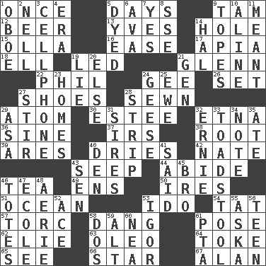 ACROSS 1. At one time in the past 5. 24-hour periods 9. Scottish cap 12. Fermented drink made from hops 13. Jacques Cousteau's middle name 14. Opening into or through something 15. Spanish pot 16. Comfort 17. Capital of Western Samoa 18. Pipe bend 19. Directed 21. American astronaut and politician John 22. Silvers or Donahue 24. Turn to the right 26. Put into a specified state 27. Imelda's hoard 28. Stitched 29. Smallest unit of an element 30. First name in cosmetics 32. Inactive volcano in Sicily 36. Trig term 37. Big collection agency 38. Carrot, for example 39. Ancient Greek god of war 40. Frees from moisture 42. Nathan's nickname 43. Ooze 44. Tolerate 46. Afternoon social gathering 49. Followers of ems 50. Angers 51. Sea 53. Wedding promise 54. Make lace 57. Torque (variant) 58. Mild oath, euphamism for damn 61. Airs 62. Writer Wiesel 63. Butter sub 64. Puff or smoke 65. Observe 66. Play the lead 67. Actor Alda or Thicke DOWN 1. Mitch Miller's instrument 2. 1994 drama film starring Jodie Foster 3. Portable communications device 4. Epoch 5. Colored 6. Actress Gardner 7. Affirmative reply 8. Compass dir. 9. Drinks excessively 10. Place in a line 11. Intended 14. Actor Linden 19. Falsehood 20. Otherwise 21. Commissioned mil. rank 23. Dwellings 24. Honkers 25. She-sheep 27. Agitate 28. Empty completely 29. White ___ sheet 31. Begets 32. Bert's buddy 33. Inedible or poisonous agaric 34. Make mention of 35. Had dinner 40. Lair 41. Expressed in words 43. Elected rep. 45. Sis' sibling 46. Hauls 47. Learning spot: Fr. 48. Nest on high 52. Adept person 53. Russian composer Stravinsky 55. "____ silly question..." 56. Adolescent 58. Two (Sp.) 59. Keyboard modifier key 60. Teachers' org. 61. Parent Teacher Assoc.