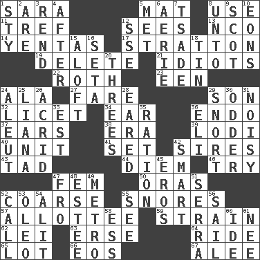 ACROSS 1. "Two Mules for Sister ____" 5. Floor protector 8. Purpose 11. Unclean, religiously 12. Perceives with the eye 13. Non-commissioned officer (abbr.) 14. Gossips 17. Ski resort town in Vermont 19. Erase 21. Foolish or stupid persons 22. Writer of Portnoy's Complaint (1969) 23. Car or cant ending 24. Insect wing 27. Conductor's collection 29. Boy, to dad 32. It is permitted: Lat. 34. Hearing organ 36. Inside; within (prefix) 37. Hearing organs 38. Epoch 39. Farming town in central California 40. A single undivided whole 41. Put into a specified state 42. Titles for men of rank and authority 43. Small amount or degree 44. South Vietnam president (1954) 46. Attempt to accomplish something 47. Opposite of masc. 50. Mouths or openings 52. Unrefined 55. Sounds asleep 57. One to whom something is allotted 59. Put through a sieve 62. Luau accessory 63. Celtic language 64. Travel on an animal 65. Car dealer's back yard 66. Greek goddess of the dawn 67. Toward shelter DOWN 1. Filthy place 2. "We ___ not amused" (Victoria) 3. Tear apart 4. Following 5. Was introduced to 6. Nest on high 7. Sadhe (variant) 8. To (old English) 9. Highlander 10. Immeasurably long periods of time 12. Compass dir. 15. Upward 16. Stalk of a moss capsule 18. Shallow baking pan 20. Threesomes 24. Eskimo relative 25. Climbing, woody, usually tropical vines 26. Sour-tasting 28. Having ears or earlike features 29. Derisive sound 30. More peculiar 31. Annoyingly loud 33. Eastern Standard Time (abbr.) 35. Food allowance for one day 36. Biblical high priest 42. Don Adams' spy role 45. Greek god of love 47. Back 48. First name in cosmetics 49. Paris' subway 51. Father Junipero _ 52. Give a ring to 53. Butter sub 54. Came down and settled, as after flight 55. Perceive with the eye 56. Travel by water 58. Curvy letter 60. Binary compound 61. Born