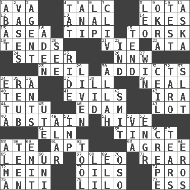 ACROSS 1. Actress Gardner 4. Baby powder 8. Globular water bottle used in Asia 12. Paper or plastic container 13. Of or related to the anus 14. Makes supply last 15. Toward the sea 17. Native american tent (variation) 18. Cod relative 19. Looks after 21. Compete 23. "One Day ___ Time" 24. Navigate 26. Compass dir. 28. Famous astronaut Armstrong 30. Inveterate users 34. Epoch 37. Deli pickle 39. Anneal 40. "___ Little Indians" 41. Vices 43. Lyricist Gershwin 44. Ballerina skirt 46. Dutch treat 47. Car dealer's back yard 48. Refrain by choice 51. Hub of activity 54. Shade tree 55. A color or tint 58. Had dinner 61. Fitting 63. Match 65. Arboreal primate 67. Butter sub 71. Tail end 72. Count _ (2 wds.) 73. Petroleums 74. Adept person 75. Opposed to 76. _ and Stitch 77. Curvy letter DOWN 1. Blind as ____ 2. Flower holders 3. Representative 4. Make lace 5. Black tropical American cuckoo 6. Infant locale 7. 154 in Roman numerals 8. Lion 9. Gumbo ingredient 10. Trial 11. "____ silly question..." 16. Arabian gulf 18. Be inclined (to) 20. Observe 22. Working for oneself (abbr.) 25. Travel on an animal 27. Victory 29. Make or become more lively 30. Assad's deity 31. To provide with a ceiling 32. Pacific island yam 33. Narrow board 34. Singer James 35. Reuben's nickname 36. Pismires 38. Flaplike covering 42. Stricken, poetically 45. Shoshoni 49. Having or resembling wings 50. Mischievous child 52. By way of 53. Engineer (abbr.) 56. Streamer paper 57. Separates forcefully 58. _ mater 59. Adolescent 60. Send forth 62. Instrument 64. Greek god of love 66. Corn or form start 68. Cards in a Roman deck? 69. Pipe bend 70. Bear (Spanish)