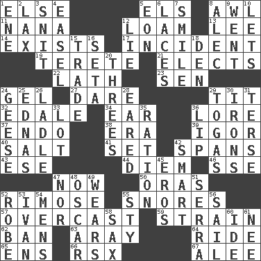 ACROSS 1. Otherwise 5. Raised railways 8. Leather borer 11. Nanny 12. Rich soil 13. Area sheltered from the wind 14. Has an existence 17. Happening 19. Cylindrical with tapered ends 21. Chooses 22. Thin strip of wood or metal 23. Elected rep. 24. Set 27. Have the gumption 29. Teat (slang) 32. Peak District village in England 34. Hearing organ 36. Old wives' tales, e.g. 37. Inside; within (prefix) 38. Epoch 39. Russian composer Stravinsky 40. Table seasoning 41. Arrange properly for use 42. Connects, as a bridge 43. Compass dir. 44. South Vietnam president (1954) 46. Compass dir. 47. Immediately 50. Mouths or openings 52. Full of chinks, cracks, or crevices 55. Sounds asleep 57. Cloudy 59. Put through a sieve 62. Forbid 63. Like ___ of sunshine 64. Travel on an animal 65. Followers of ems 66. Acura sports coupe 67. Toward shelter DOWN 1. Compass dir. 2. Not strict 3. In a ____ (agitated or irritated) 4. Artist's stand 5. Period of immesurable duration 6. Shoestrings 7. Grin 8. Actor Baldwin 9. Gone 10. Allows 12. Falsehood 15. Exchange 16. Stalk of a moss capsule 18. Lair 20. Triplets 24. Honkers 25. Ferber et al. 26. Dipping utensil 28. Having ears or earlike features 29. Ancient Roman robes 30. Removes the wrinkles 31. Laconic 33. Car dealer's back yard 35. Food allowance for one day 36. Mouth edge 42. Don Adams' spy role 45. Greek god of love 47. And not 48. Motion picture award 49. Puts on (as clothing) 51. Spanish missionary in California 52. Loose flowing garment 53. _ the terrible 54. Not women's 55. Filthy place 56. Move on water 58. Saxophone 60. Binary compound 61. Born