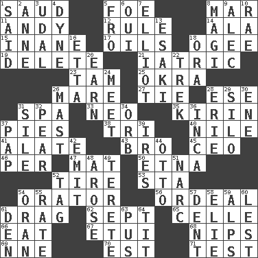 ACROSS 1. Saudi Arabian king (1953-1964) 5. Enemy 8. Third mo. 11. Actor Griffith 12. Governing power 14. Insect wing 15. Empty; void 17. Lubricates 18. Double curve, resembling the letter S 19. Erase 21. Of or pertaining to medicine 23. Scottish cap 25. Gumbo ingredient 26. Female horse 27. Standoff 28. Compass dir. 31. Health resort 33. Modern: prefix 35. Japanese brewing company 37. Sliced desserts 38. Three (prefix) 40. Mediterranean tributary 41. Having winglike extensions 43. Sis' sibling 45. Corporate head (abbr.) 46. For each 47. Floor protector 50. Inactive volcano in Sicily 52. Hoop that covers a wheel 53. R.R. building 54. Speaker 56. Severe or trying experience 61. To draw with force 62. Back-to-school mo. 65. Cell (Danish) 66. Ingest 67. Needle holder 68. Cuts off 69. Compass dir. 70. Eastern Standard Time (abbr.) 71. Trial DOWN 1. Expressed in words 2. Queen of England 1702-14 3. Hereditary estate 4. Unit of force 5. Away 6. Fr. "Yes" 7. American author Paul (1891-1958) 8. Wise men 9. Actor Baldwin 10. Actress Charlotte 13. 1973 Nobel Price Winner (Physics) Leo 16. Singer James 18. Mouth or opening 20. Merit 22. Long journey 24. Rendezvous 26. Vertical spar for supporting sails 28. 4th largest of the Great Lakes 29. Grain storage tower 30. Compass dir. 31. Drop; flow; fall 32. Lightbulb-shaped fruit 34. Globe 36. South American Indian 37. Infant food 39. Angers 42. Send forth 44. Von Bismarck 48. Came up 49. Cigar-shaped 51. Drug cop 52. Label 54. NW Algerian seaport 55. Assign a rank or rating to 57. Undesirable depression on a surface 58. Writer Wiesel 59. High mountains 60. For fear that 61. Lair 63. Fluid product of inflammation 64. Teat (slang)