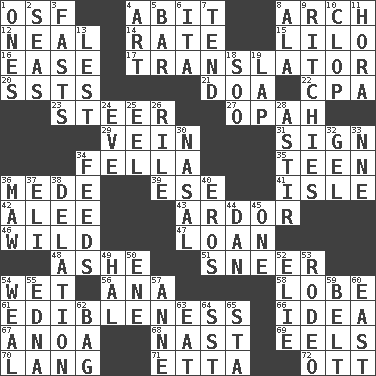 ACROSS 1. Order of Saint Francis (abbr.) 4. "This won't hurt ____!" 8. Bowlike part 12. Actress Patricia 14. Pace 15. _ and Stitch 16. Comfort 17. Interpreter 20. Fast planes 21. ___ good deed 22. Numbers guy (abbr.) 23. Bull 27. Brightly colored fish 29. Distinctive style or manner 31. Signal 34. Man or boy (slang) 35. Adolescent 36. Ancient Persian 39. Compass dir. 41. Small island 42. Toward shelter 43. Zeal 46. Rampant 47. Grant temporary use of 48. American tennis player Robert 51. Scornful expression 54. Dripping 56. Santa ___, CA 58. Ear part 61. The property of being fit to eat 66. The content of cognition 67. Small Philippine buffalo 68. Political cartoonist Thomas 69. Snakelike fish 70. Austrian-born American filmmaker Fritz 71. Singer James 72. Baseball player Mel DOWN 1. Singles 2. Oceans 3. Goes without food and/or water 4. Nonscientific branch of learning 5. Oblong piece of solid material 6. Call ___ day 7. Watch over 8. Insect wing 9. Actors Guy, Robert Welles, and Clint 10. Hoof sound 11. Israeli folk dance 13. For fear that 18. "Barney Miller" actor Jack 19. Infant locale 24. First lady 25. Snakelike fish 26. Cause heat under the collar 28. Having gotten out of bed 30. Relating to the nose 32. Set 33. Compass dir. 34. Gives food to 36. Opening into something insatiable 37. Biblical high priest 38. Conveyance 40. Greek god of love 44. One of the 12 tribes of Israel 45. Single 49. Actor Linden 50. Compass dir. 52. Writer Wiesel 53. Cowboy competition 54. Welt 55. Pulitzer Prize-winning author Ferber 57. Queen of England 1702-14 59. Waist strap 60. 90 degrees 62. Container for groceries 63. Ingest 64. Fast jet (abbr.) 65. R.R. building