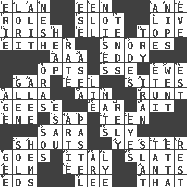 ACROSS 1. Style 5. Car or cant ending 8. One (Scot) 11. Hero or heavy, e.g. 12. Position in a hierarchy or organization 14. 54 in ancient Rome 15. From or relating to Ireland 17. Writer Wiesel 18. Drink excessively 19. One or the other of two 21. Sounds asleep 23. Auto club (abbr.) 25. Whirlpool 26. Elects 27. Compass dir. 28. She-sheep 31. Slender fish 33. Snakelike fish 35. Settings 37. Silent film actress Nazimova 38. Direct toward a target or goal 40. Undersized animal 41. Honkers 43. Ewer handle 45. Small island 46. Compass dir. 47. Plant excrement 50. Adolescent 52. "Two Mules for Sister ____" 53. Playfully artful 54. Yells 56. Last 61. Travels 62. Slanted text style (abbr.) 65. Chalkboard 66. Shade tree 67. Suggestive of the supernatural 68. Pismires 69. Begley and Asner 70. Area sheltered from the wind 71. Not this but _ DOWN 1. One of the Great Lakes 2. Australian parrot (variant) 3. Came down and settled, as after flight 4. Delicate 5. Compass dir. 6. Pipe bend 7. Annoying sounds 8. Medicinal plant 9. Pinches, bites 10. Night before a holiday 13. Looks after 16. Pile 18. Attempt to accomplish something 20. Assign a rank or rating to 22. Lyric poems 24. At sea 26. Mouths or openings 28. Needle case 29. Left 30. Eastern Standard Time (abbr.) 31. Small, secluded valley 32. Toward shelter 34. Falsehood 36. SW Asia republic 37. Grow older 39. Floor protectors 42. Son of Isaac 44. Have confidence or faith in 48. Nick name for Arthur 49. Soft color 51. Sight organs 52. Distress signal 54. Exchanged or delivered for money 55. Is hesitant and indecisive 57. Narrow board 58. Hyperbolic tangent 59. Singer James 60. Respite 61. Turn to the right 63. "We ___ not amused" (Victoria) 64. Potassium hydroxide